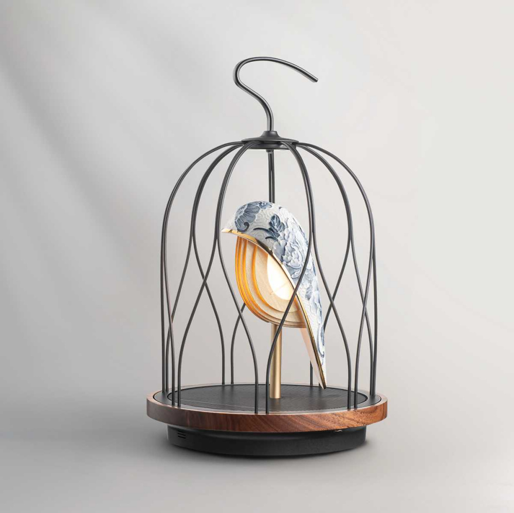 Marke DAQI CONCEPT Modell Jingoo – Blue White Peony Gewicht 790g Dimensionen 180 × 180 × 280 mm Materialien Vogel aus aus weisser Keramik mit dunkelblauen Blumenmuster und goldfarbenemn Käfig auf einem Sockel aus Walnussholz Funktionen Bluetooth-Lautsprecher und LED-Tischlampe mit 3 Helligkeitsstufen und stufenloser Helligkeit per Touch Stromversorgung Kabel und Netzteil (230V)