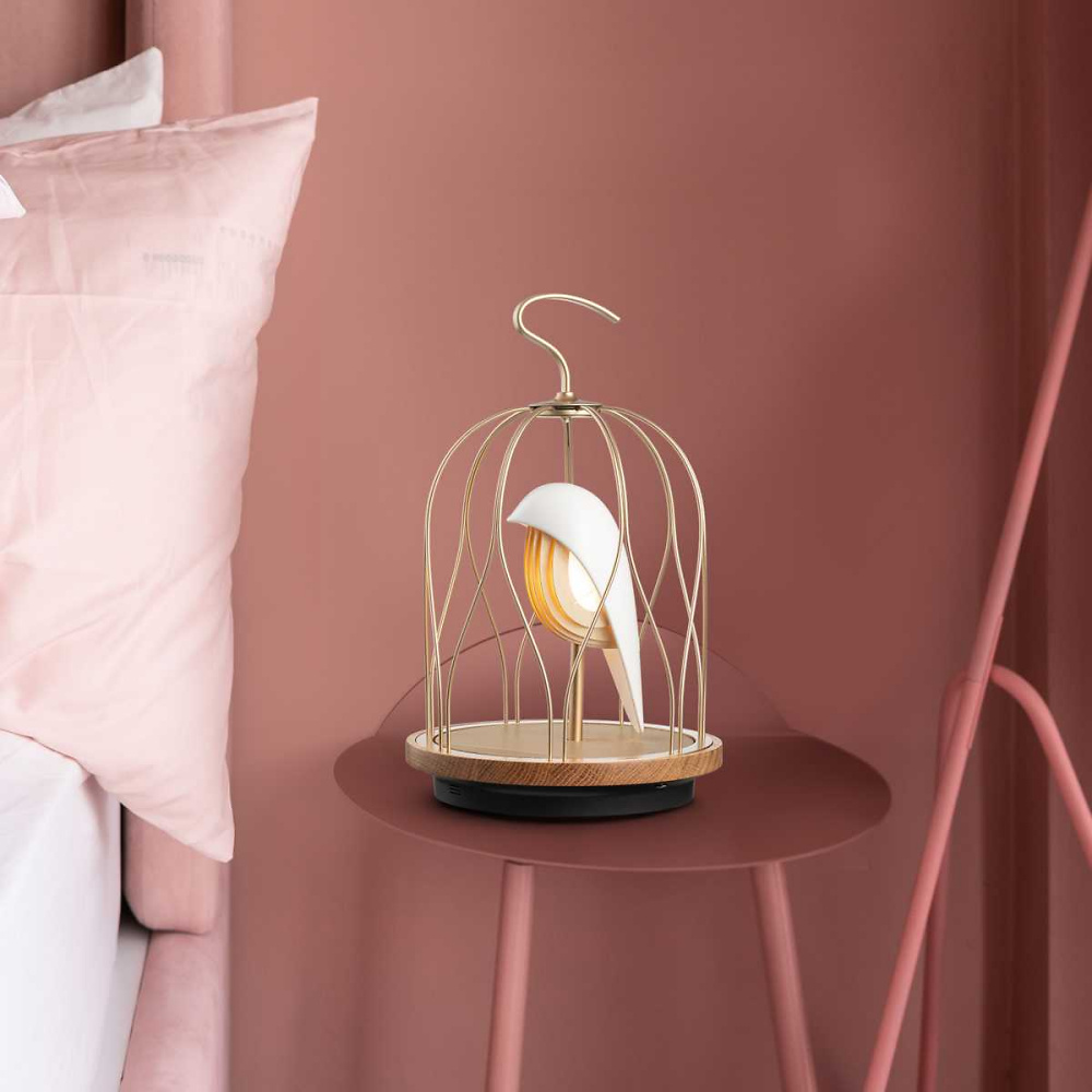 Marke DAQI CONCEPT Modell Jingoo – Ivory White Gewicht 790g Dimensionen 180 × 180 × 280 mm Materialien Vogel aus aus weisser Keramik und goldfarbenem Käfig auf einem Sockel aus Fichtenholz Funktionen Bluetooth-Lautsprecher und LED-Tischlampe mit 3 Helligkeitsstufen und stufenloser Helligkeit per Touch Stromversorgung Kabel und Netzteil (230V)
