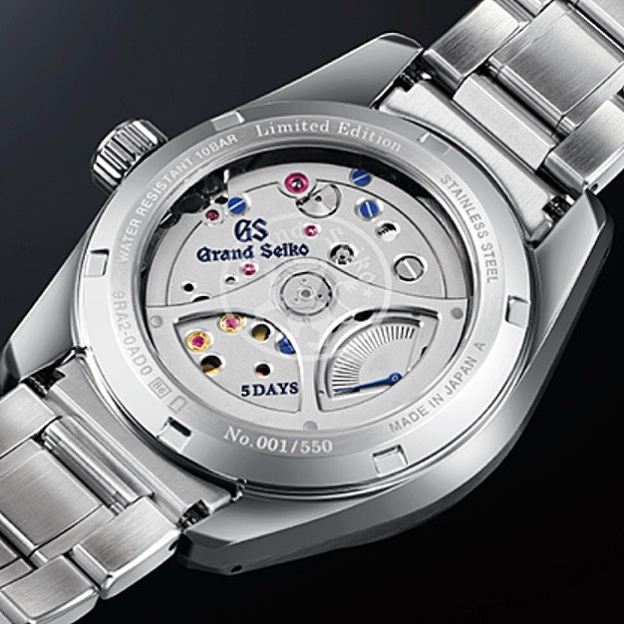 Marke GRAND SEIKO Modell Heritage Collection Referenz SLGA013 – Limitiert auf 550 Exemplare Dimensionen 40mm Materialien Gehäuse aus Edelstahl mit Sichtboden aus Saphirglas, schwarzes Zifferblatt mit silberfarbenen, polierten Zeigern und Indexen, geschützt durch ein Saphirglas, Edelstahlarmband und Faltschliesse jeweils aus Edelstahl Kaliber Spring Drive-Manufakturwerk, Kaliber 9RA2 mit automatischem Aufzug Funktionen Anzeige der Stunden, Minuten und Sekunden inkl. Datums- und Gangreserveanzeige