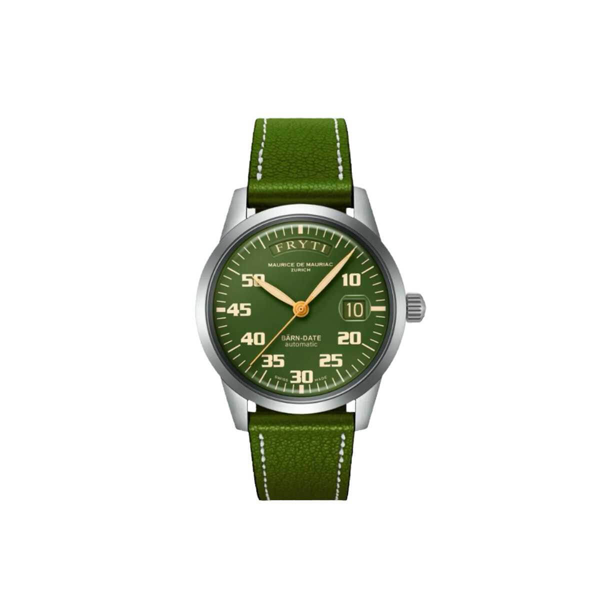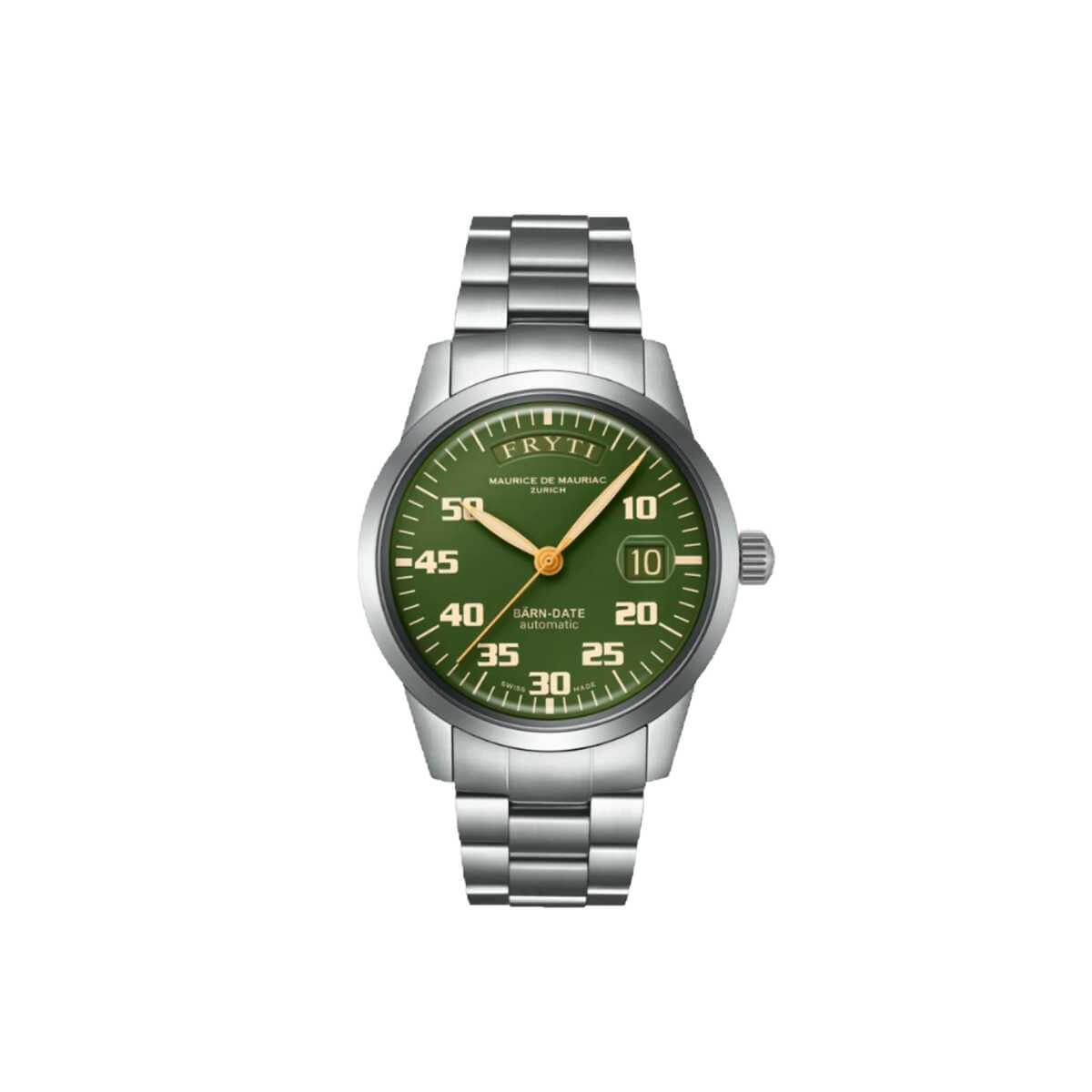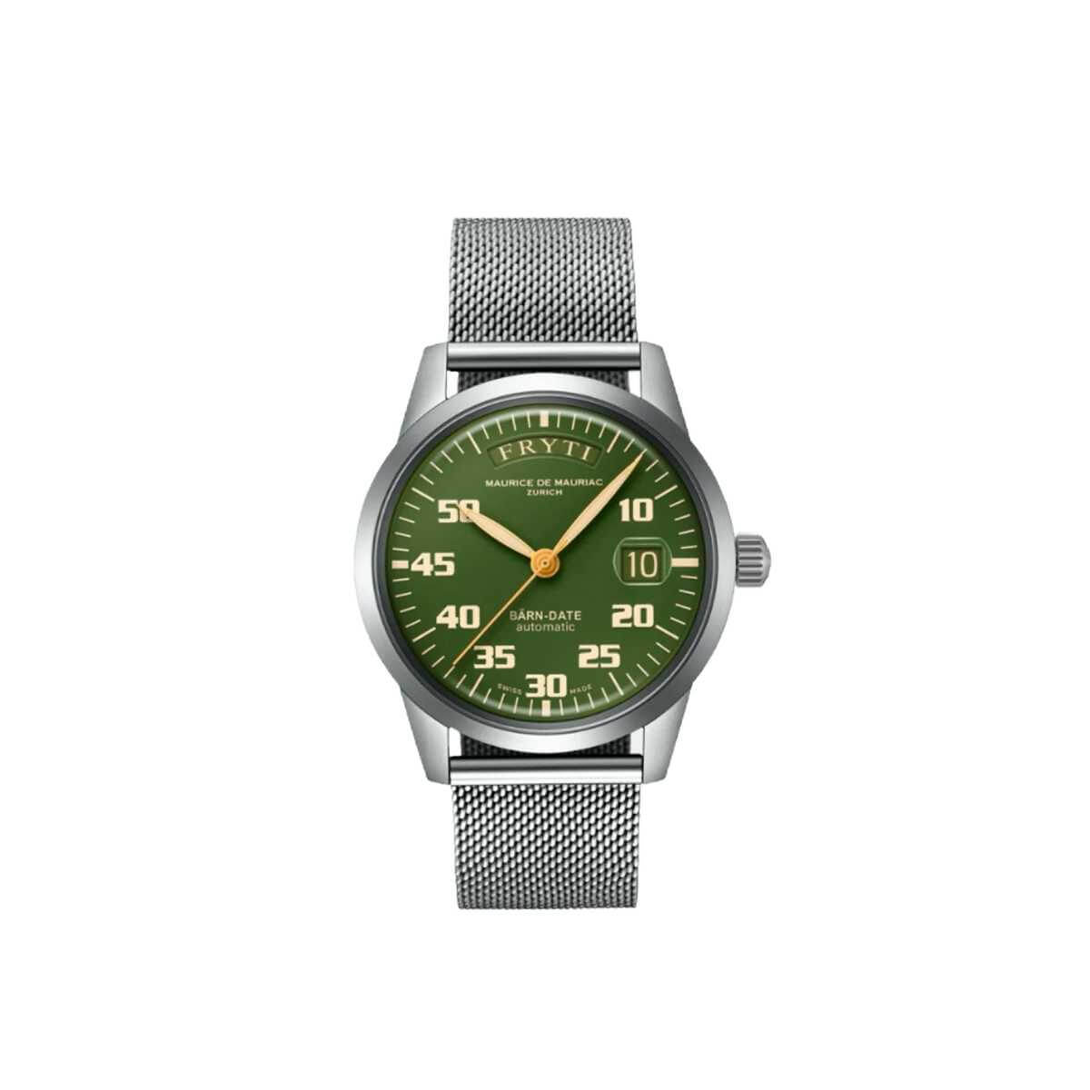 Marke MAURICE DE MAURIAC Modell BÄRN-DATE Referenz MDM.130.BärnDate.V1 Dimensionen 39 mm Materialien Gehäuse aus satiniertem Edelstahl, grünes Zifferblatt geschützt durch ein blau entspiegeltes Saphirglas, Saphirglas-Sichtboden. Folgende Armbandmöglichkeiten stehen zur Auswahl: Lederband mit Dornschliesse aus Edelstahl, Edelstahl-Milanaiseband mit Sicherheitsschliesse oder Edelstahlband mit Drückerfaltschliesse. Uhrwerk Mechanisches Uhrwerk, ETA-Kaliber 2834 mit automatischem Aufzug Funktionen Anzeige der Stunden, Minuten und Sekunden inkl. Wochentags- und Datumsanzeige