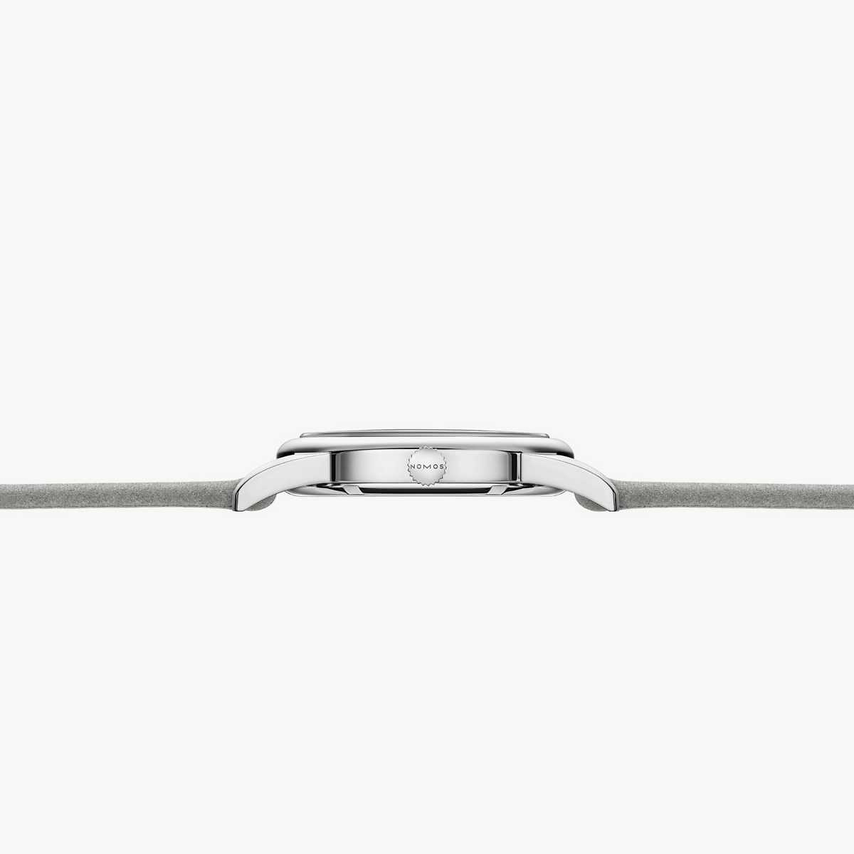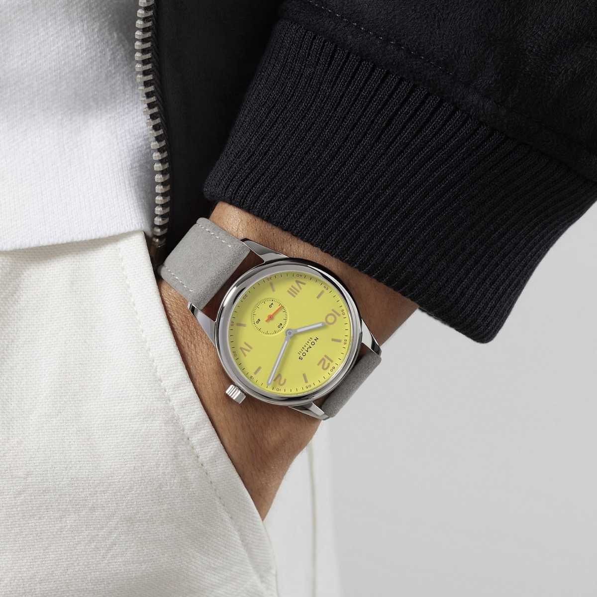 Zweiteiliges Gehäuse aus Edelstahl, gelbes Zifferblatt mit römischen Stundenziffern sowie Indizes mit Superluminova beige (blau nachleuchtend), rhodinierte, mit Superluminova weiß ausgelegte (blau nachleuchtende) Zeiger, Sekundenzeiger neonorange und geschützt durch gewölbtes Saphirglas, Uhr begleitet von einem veganen, samtgrauen, rembordierten Veloursband