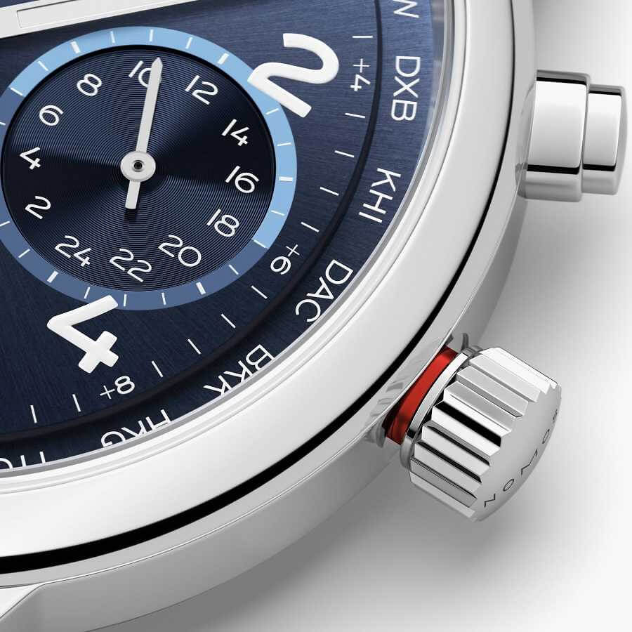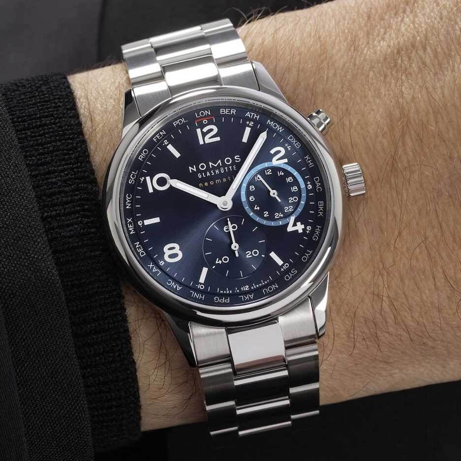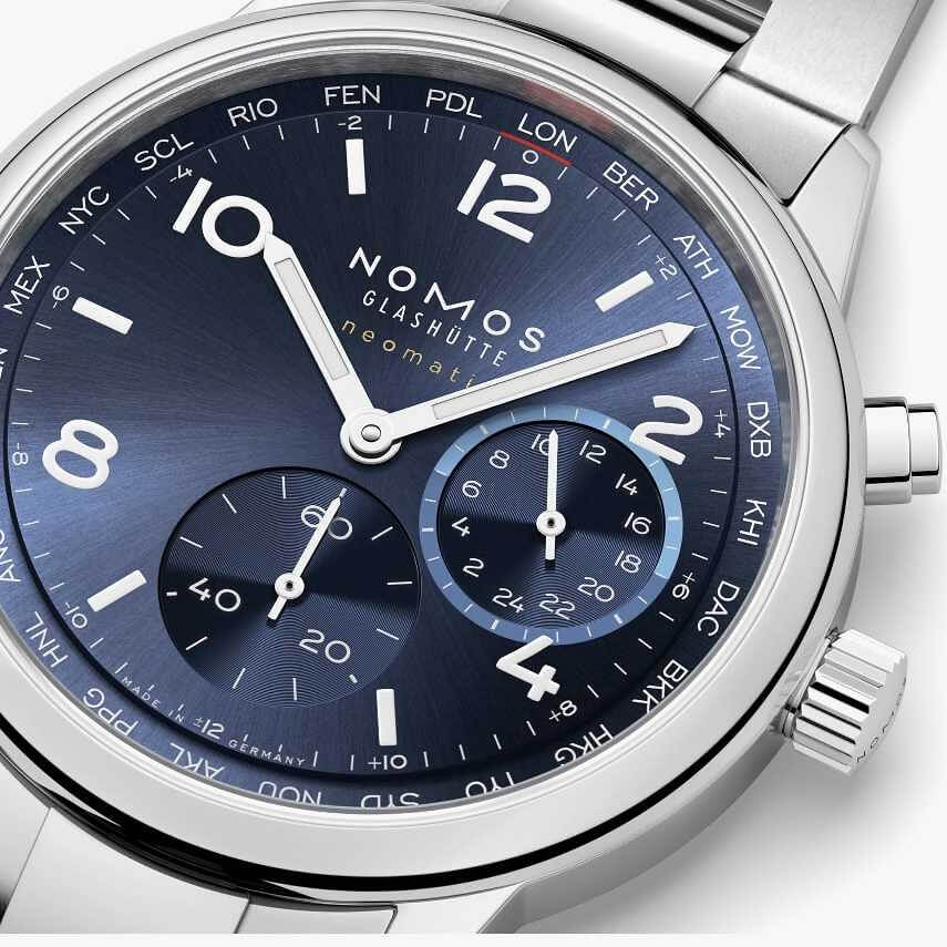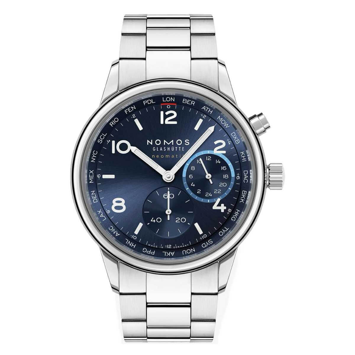 Marke NOMOS Modell Club Sport neomatik Weltzeit Blau Referenz 790 Dimensionen 40 mm Materialien Gehäuse aus Edelstahl mit Gehäuseboden aus Saphirglas, blau galvanisiertes Zifferblatt, rhodinierte Stunden- und Minutenzeiger, Stundenziffern und Indizes in weiss mit Superluminova ebenfalls in weiss, geschützt durch ein gewölbtes, auf der Innenseite entspiegeltes Saphirglas, begleitet vom Metallband «Club Sport» mit Schnellwechsel Federstegen Kaliber Mechanisches Manufakturwerk, Kaliber DUW 3202 mit automatischem Aufzug Funktionen Anzeige der Stunden, Minuten und Sekunden inkl. Heimatanzeige und Weltzeitfunktion