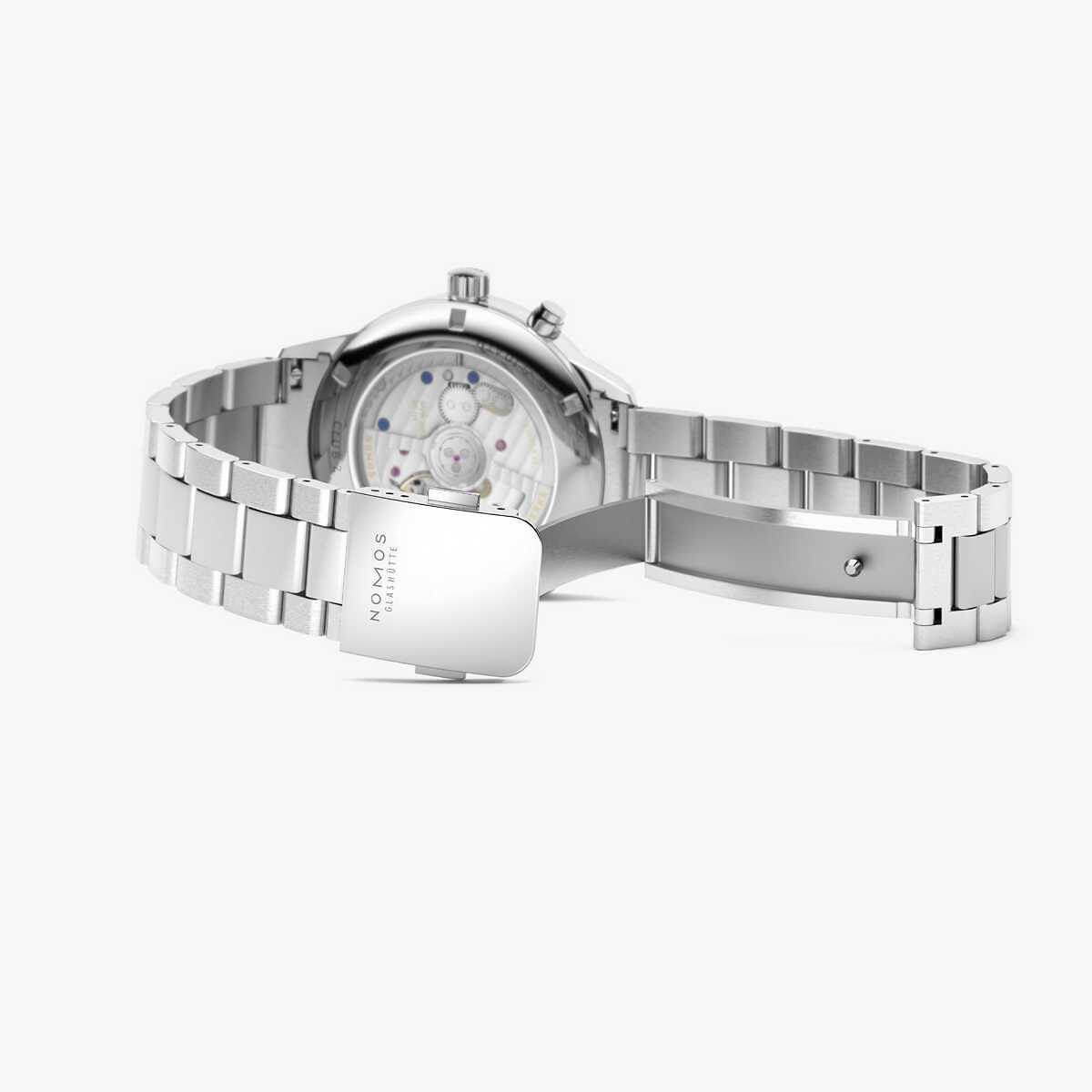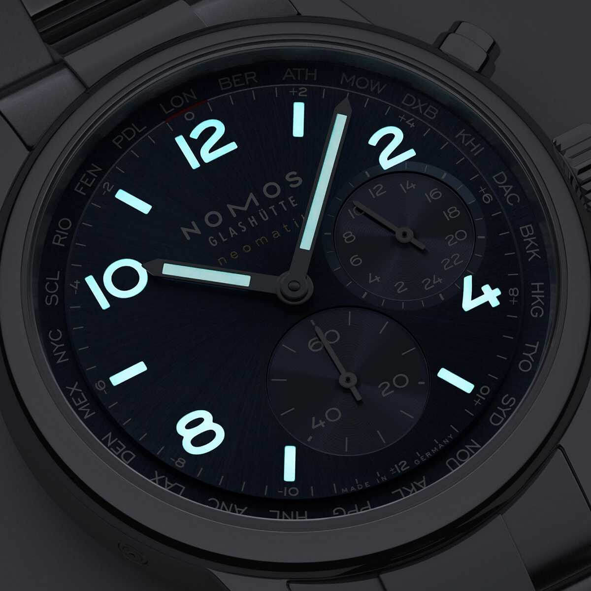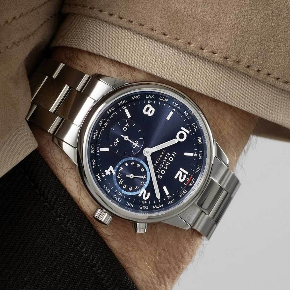 Marke NOMOS Modell Club Sport neomatik Weltzeit Blau Referenz 790 Dimensionen 40 mm Materialien Gehäuse aus Edelstahl mit Gehäuseboden aus Saphirglas, blau galvanisiertes Zifferblatt, rhodinierte Stunden- und Minutenzeiger, Stundenziffern und Indizes in weiss mit Superluminova ebenfalls in weiss, geschützt durch ein gewölbtes, auf der Innenseite entspiegeltes Saphirglas, begleitet vom Metallband «Club Sport» mit Schnellwechsel Federstegen Kaliber Mechanisches Manufakturwerk, Kaliber DUW 3202 mit automatischem Aufzug Funktionen Anzeige der Stunden, Minuten und Sekunden inkl. Heimatanzeige und Weltzeitfunktion