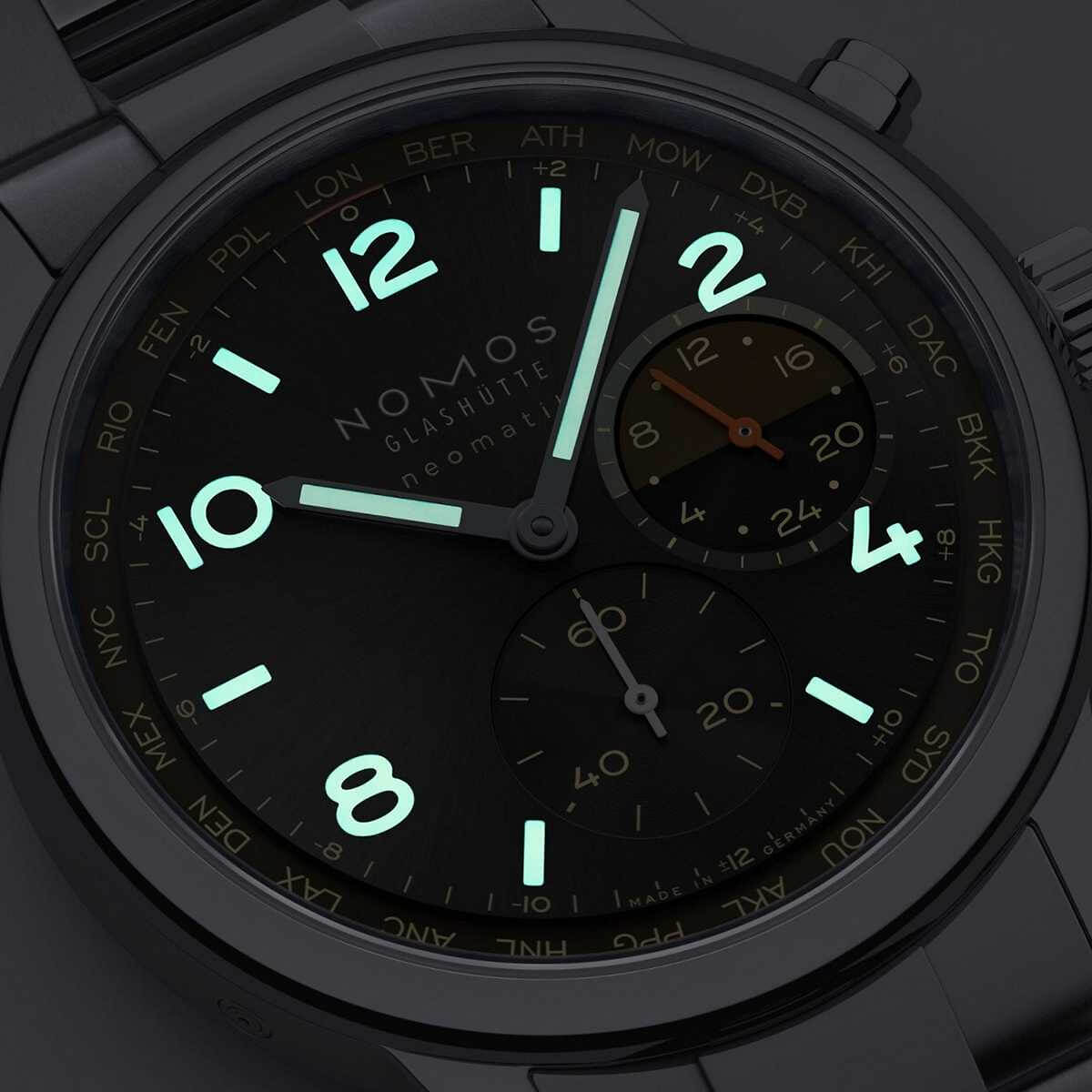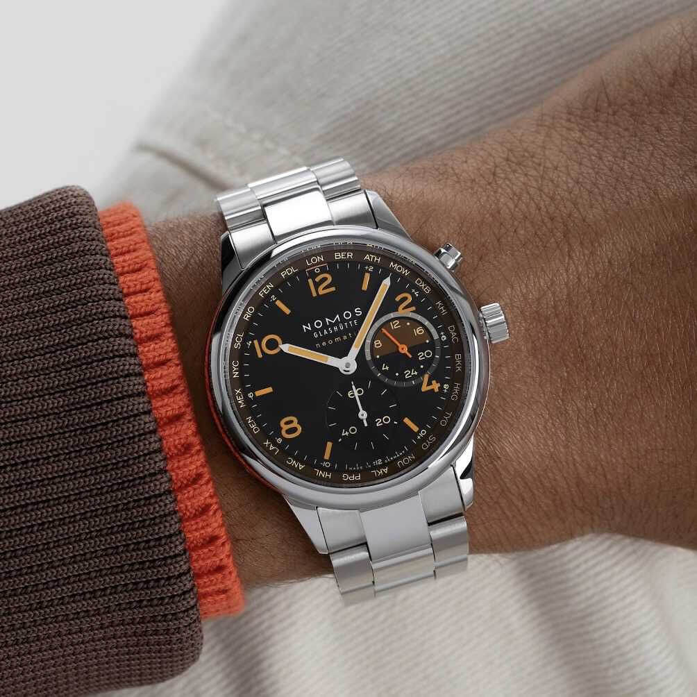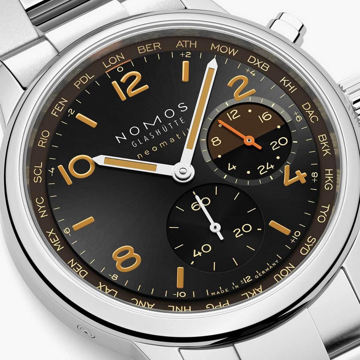 Die Night-Navigation-Serie des NOMOS Worldtimers steht ganz im Zeichen der nächtlichen Atmosphäre moderner Metropolen weltweit. Das Modell Grid, mit einem schwarzen Zifferblatt und raffiniert gesetzten orangefarbenen Akzenten, erinnert an das warme Bernsteinleuchten, in dem viele Großstädte nach Einbruch der Dunkelheit erstrahlen und das aus der Vogelperspektive wie ein lebendiges, pulsierendes Raster wirkt.Die Weltzeituhr ermöglicht die gleichzeitige Anzeige aller 24 Zeitzonen und ist zusätzlich mit einer 24-Stunden-Anzeige inklusive Tag-Nacht-Indikator für die Heimatzeit ausgestattet. Die Edition ist auf jeweils 175 Exemplare begrenzt – und schafft damit eine exklusive sowie persönliche Verbindung zur Welt.