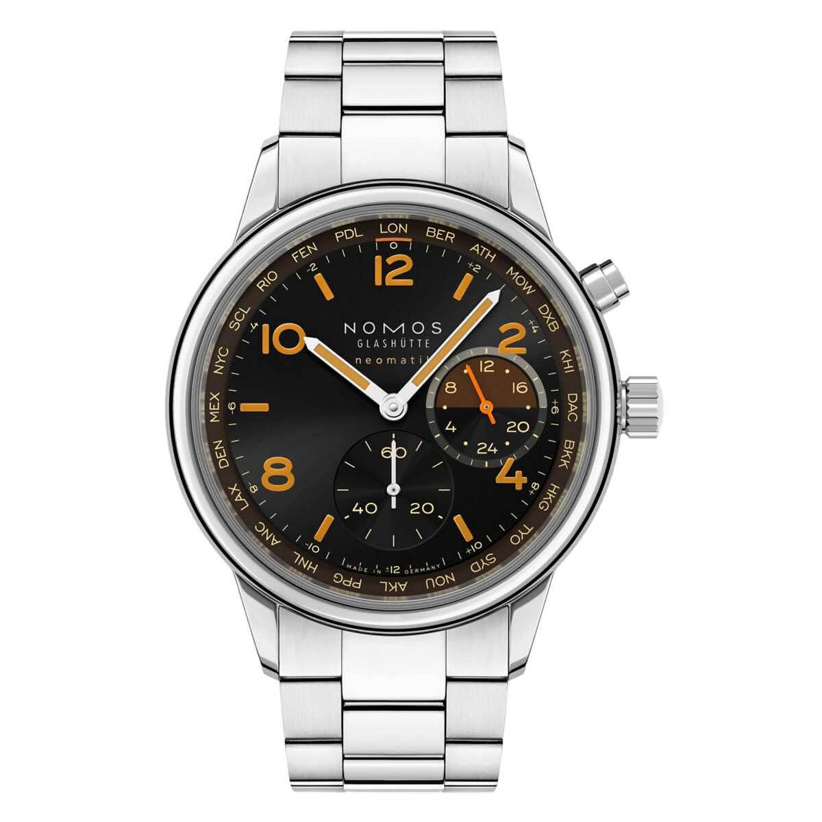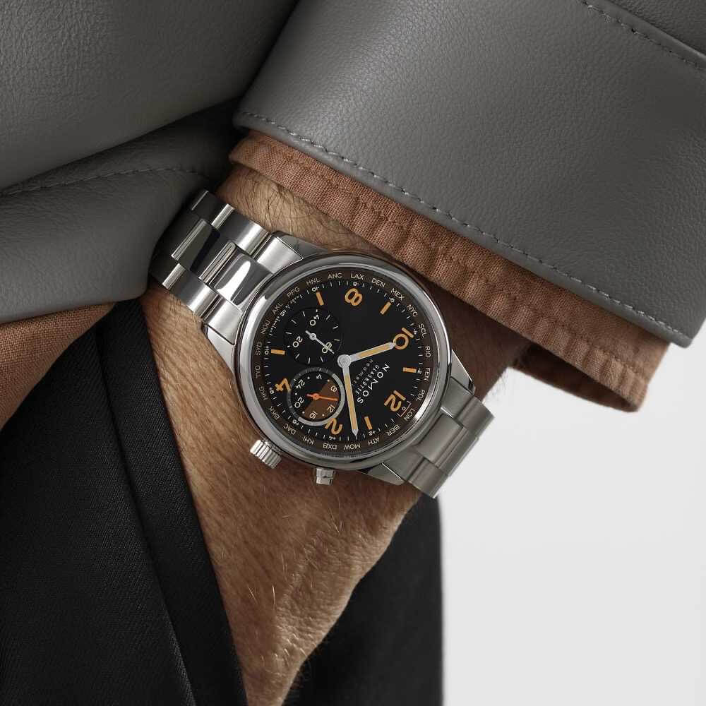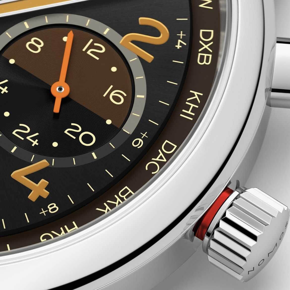 Die Night-Navigation-Serie des NOMOS Worldtimers steht ganz im Zeichen der nächtlichen Atmosphäre moderner Metropolen weltweit. Das Modell Grid, mit einem schwarzen Zifferblatt und raffiniert gesetzten orangefarbenen Akzenten, erinnert an das warme Bernsteinleuchten, in dem viele Großstädte nach Einbruch der Dunkelheit erstrahlen und das aus der Vogelperspektive wie ein lebendiges, pulsierendes Raster wirkt.Die Weltzeituhr ermöglicht die gleichzeitige Anzeige aller 24 Zeitzonen und ist zusätzlich mit einer 24-Stunden-Anzeige inklusive Tag-Nacht-Indikator für die Heimatzeit ausgestattet. Die Edition ist auf jeweils 175 Exemplare begrenzt – und schafft damit eine exklusive sowie persönliche Verbindung zur Welt.