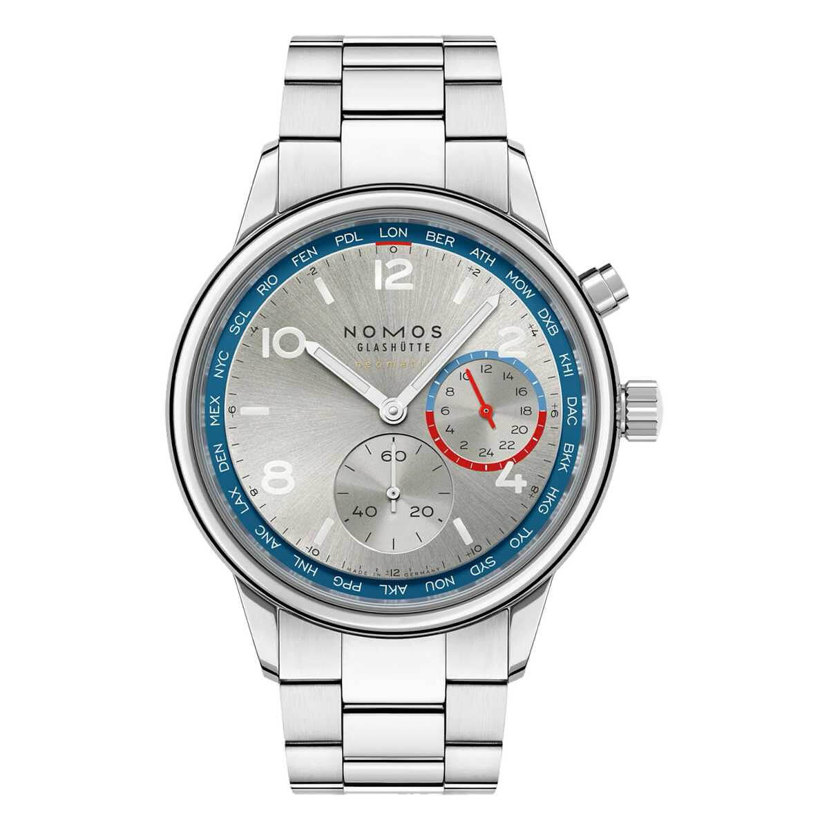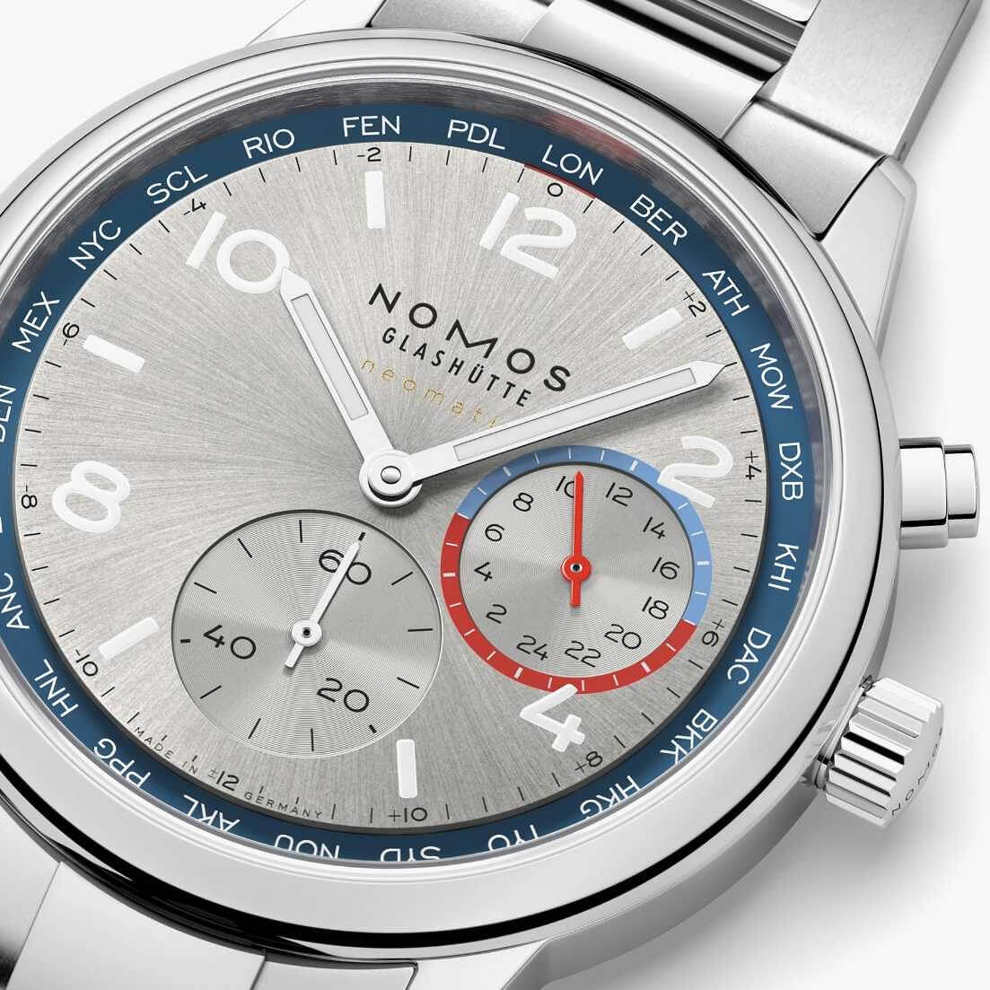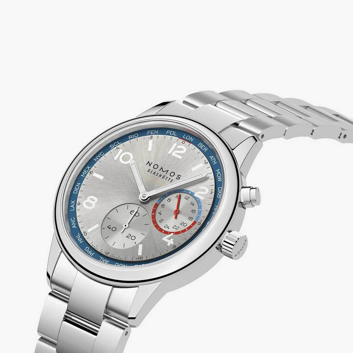 Marke NOMOS Modell Club Sport neomatik Weltzeit Silber Referenz 791 Dimensionen 40 mm Materialien Gehäuse aus Edelstahl mit Gehäuseboden aus Saphirglas, silberfarbiges Zifferblatt, rhodinierte Stunden- und Minutenzeiger, Stundenziffern und Indizes in weiss mit Superluminova ebenfalls in weiss, geschützt durch ein gewölbtes, auf der Innenseite entspiegeltes Saphirglas, begleitet vom Metallband «Club Sport» mit Schnellwechsel Federstegen Kaliber Mechanisches Manufakturwerk, Kaliber DUW 3202 mit automatischem Aufzug Funktionen Anzeige der Stunden, Minuten und Sekunden inkl. Heimatanzeige und Weltzeitfunktion