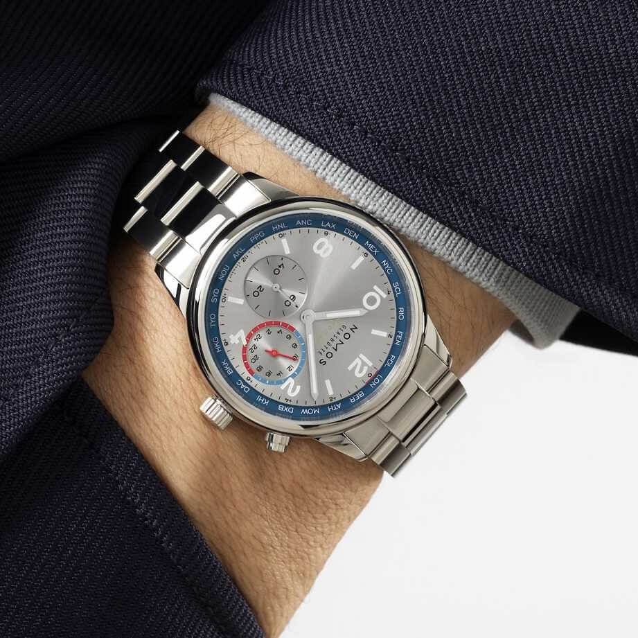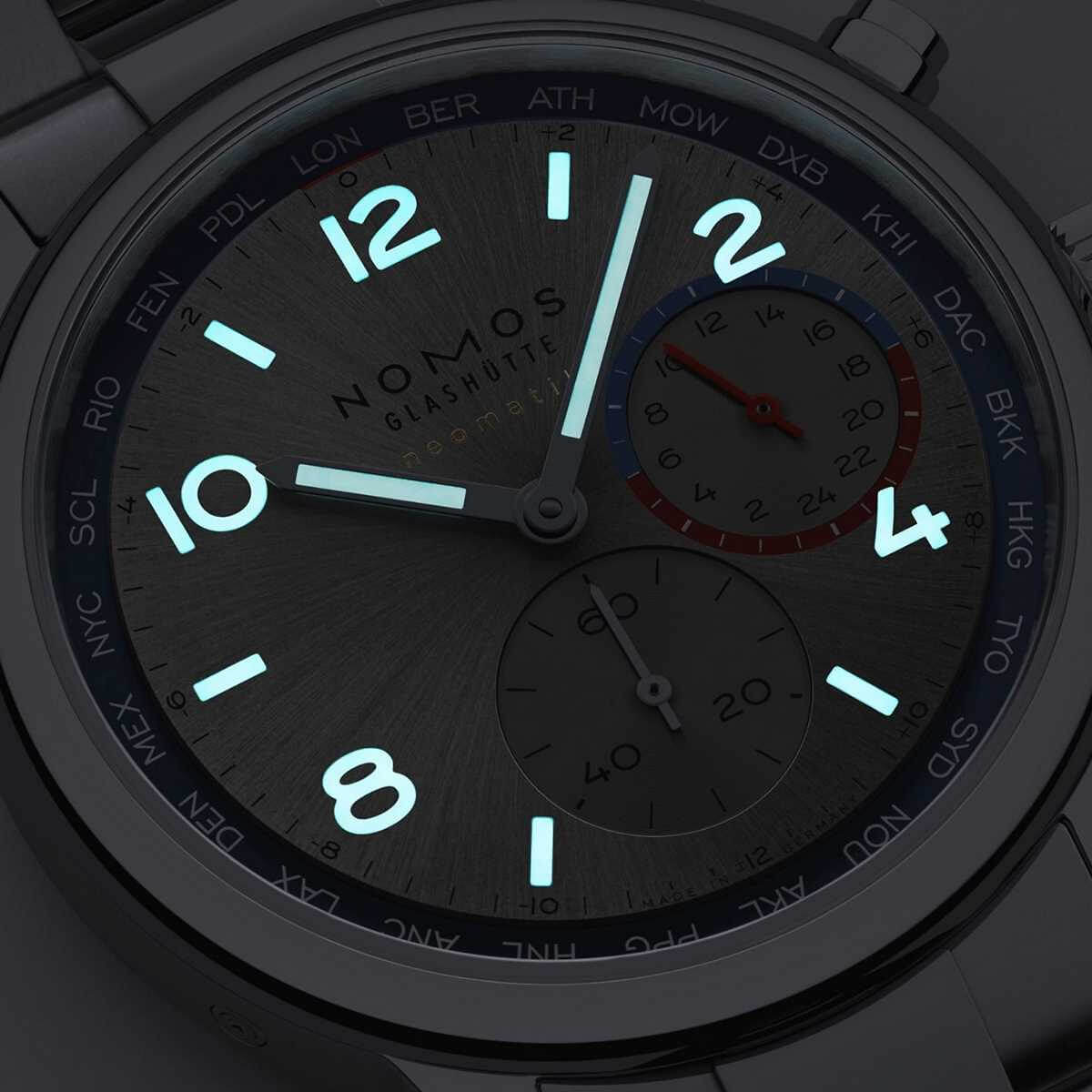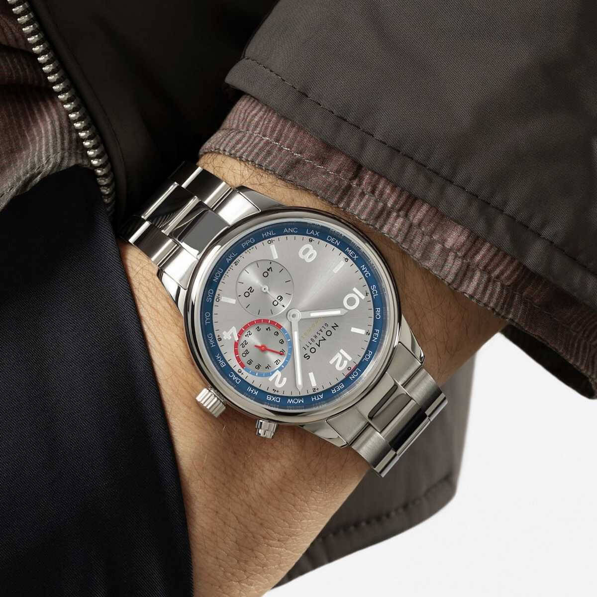 Marke NOMOS Modell Club Sport neomatik Weltzeit Silber Referenz 791 Dimensionen 40 mm Materialien Gehäuse aus Edelstahl mit Gehäuseboden aus Saphirglas, silberfarbiges Zifferblatt, rhodinierte Stunden- und Minutenzeiger, Stundenziffern und Indizes in weiss mit Superluminova ebenfalls in weiss, geschützt durch ein gewölbtes, auf der Innenseite entspiegeltes Saphirglas, begleitet vom Metallband «Club Sport» mit Schnellwechsel Federstegen Kaliber Mechanisches Manufakturwerk, Kaliber DUW 3202 mit automatischem Aufzug Funktionen Anzeige der Stunden, Minuten und Sekunden inkl. Heimatanzeige und Weltzeitfunktion
