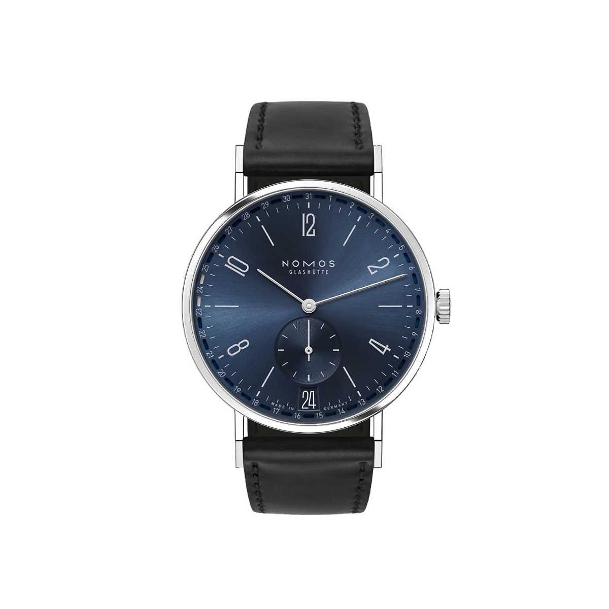 Weitblickend: Zwei Markierungen umrahmen beim umlaufenden NOMOS-Ringdatum den jeweiligen Tag. Auf dem dunkelblauen Zifferblatt mit silbernen Ziffern und Indexen erscheinen sie in Weiß – ebenso wie das Datum im zusätzlichen Fenster bei 6 Uhr. Die doppelte Datumsanzeige bewahrt den Überblick und legt zugleich den Fokus auf das Detail. Die Tangente 2date ist das erste Handaufzugsmodell, das mit dem exklusiven Ringdatum ausgestattet ist. Etwas feiner als das neomatik-Update-Modell: der Gehäusedurchmesser misst 37,5 Millimeter.