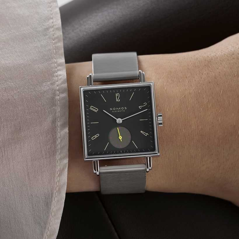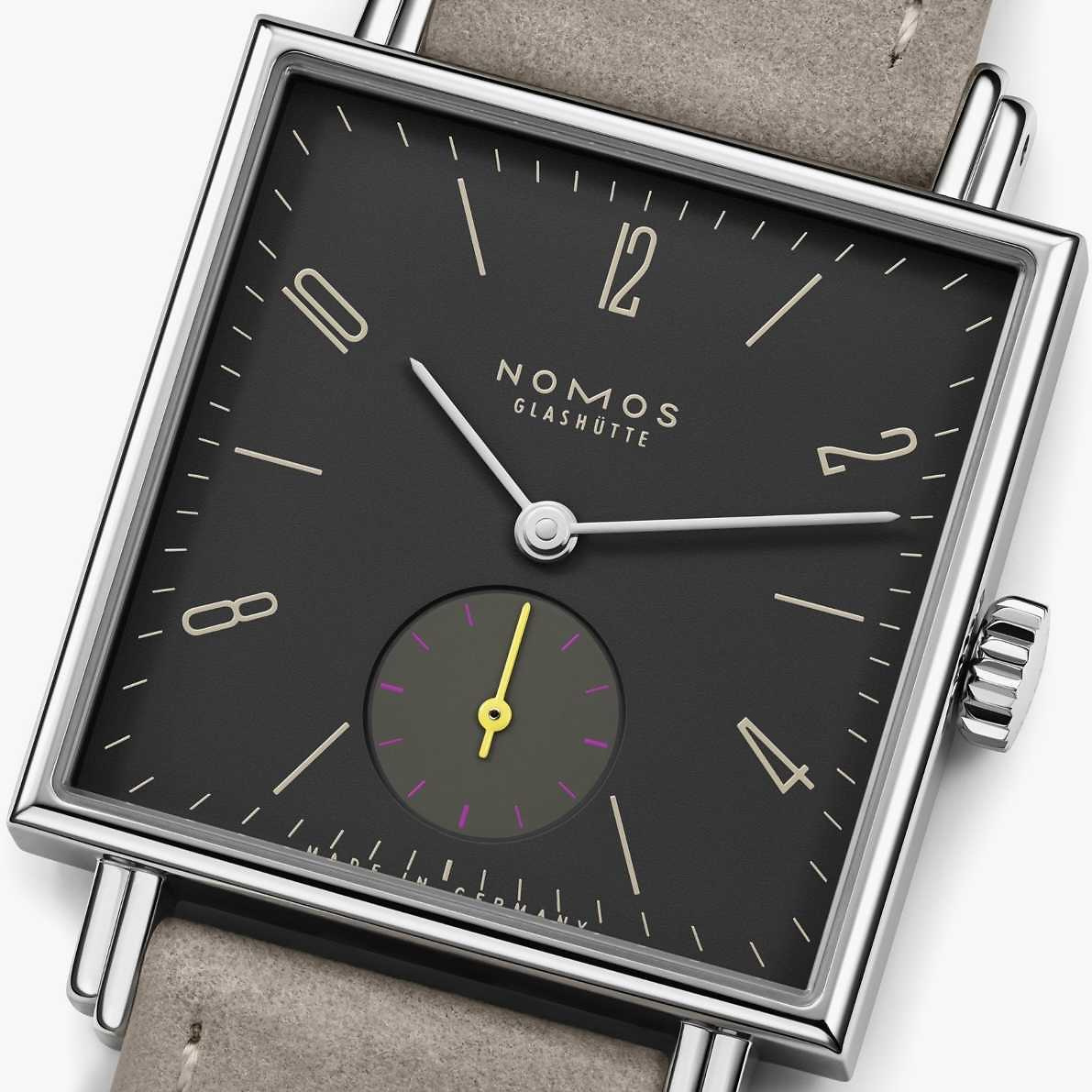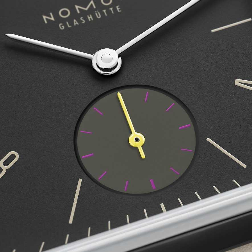 Marke NOMOS Modell Tetra Referenz 440 Dimensionen 30 mm Materialien Gehäuse aus Edelstahl mit Saphirglasboden, anthrazitfarbenes Zifferblatt geschützt durch ein Saphirglas und beigem, veganen Veloursband Kaliber Mechanisches Manufakturwerk, Kaliber DUW4001 mit Handaufzug Funktionen Anzeige der Stunden, Minuten und Sekunden