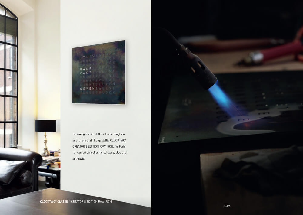 OHNE ZEIGER. OHNE ZIFFERN.Die QLOCKTWO EARTH ist eine Hommage an das einzigartige Kulturgut Zeit und unseren Planeten. Sie zeigt die 24 Stunden eines Tages auf einer Wortmatrix in den Sprachen unserer Welt an. Die QLOCKTWO EARTH 45 CREATOR'S EDITION RAW IRON mit dem auswechselbaren Frontcover ist aus rohem, thermobehandeltem Stahl. Der Farbton variiert zwischen Tiefschwarz, Blau und Anthrazit entsteht durch die thermische Bearbeitung der Oberfläche durch einen Künstler. Jedes dieser Unikate wird mit Lasergravur signiert und einzeln nummeriert. Die 45 x 45 cm grosse EARTH 45 verleiht, ob an der Wand oder am Standfuss, jedem Raum ein einzigartiges, edles Ambiente.