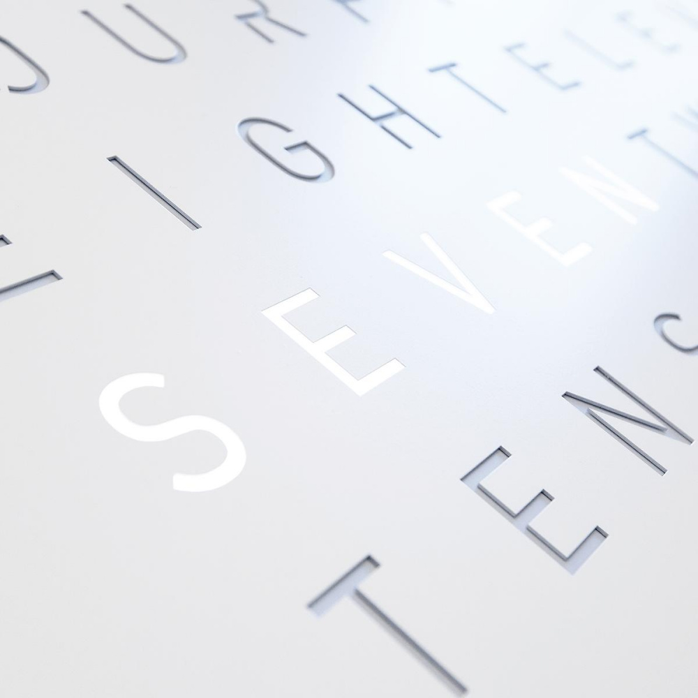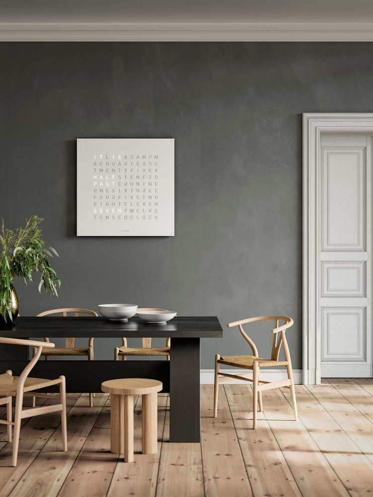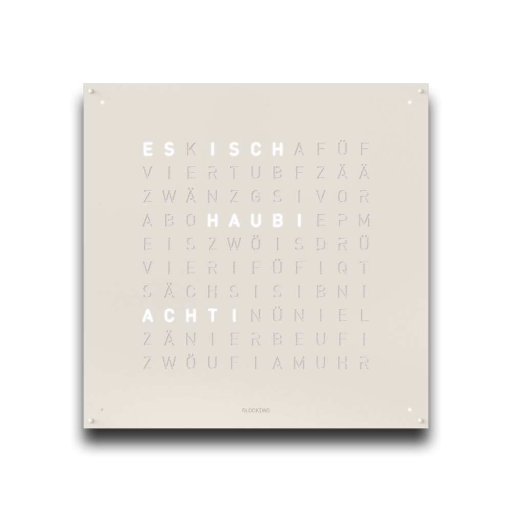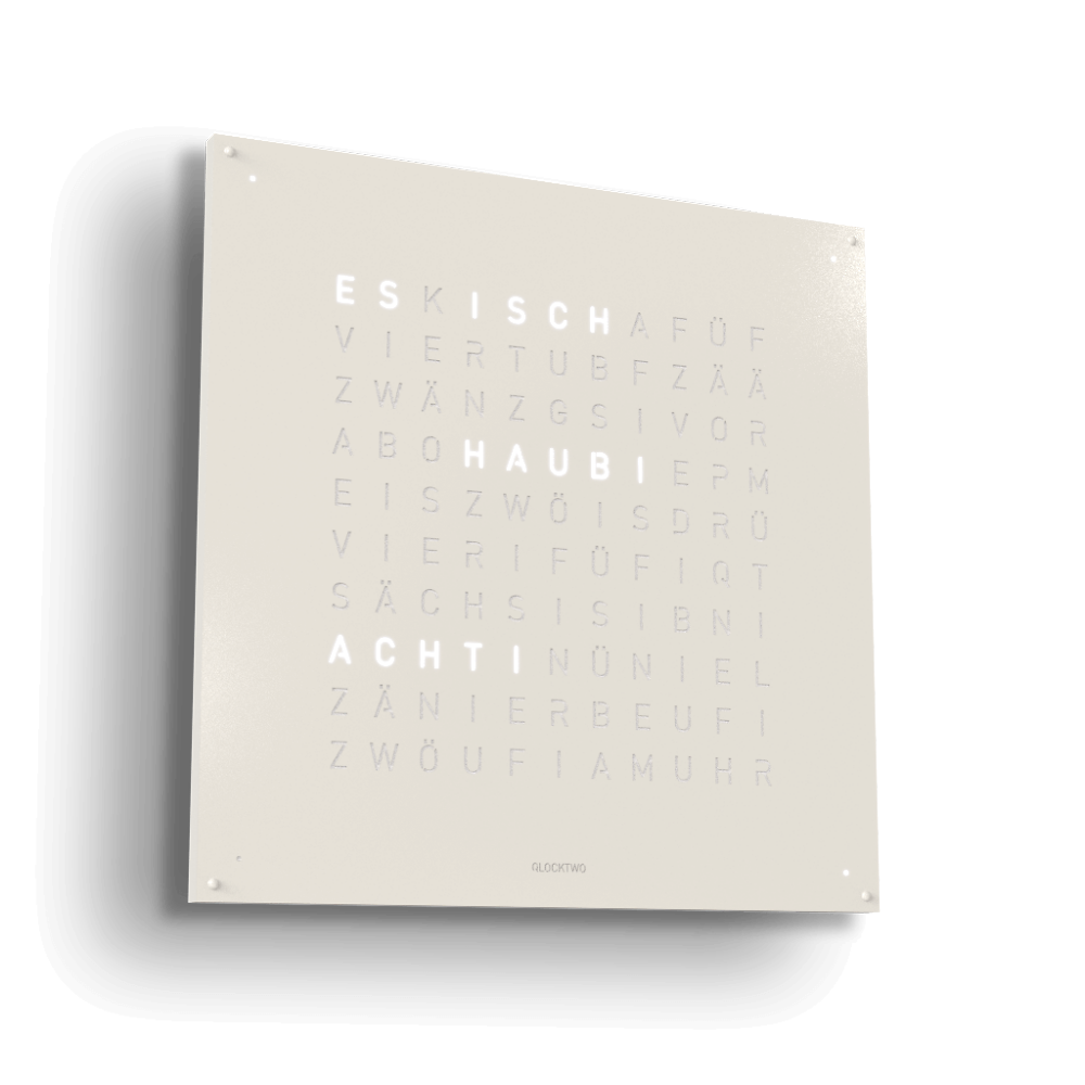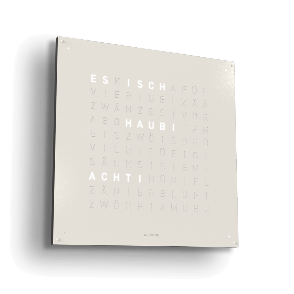 WHITE PEPPER in einen einzigartigen Dialog. Denn mit ihrer vermeintlich kühlen Optik nimmt sie durch Lichtreflexe die Farbigkeit und Wärme der Umgebung auf und verschmilzt mit ihr.Die 90 x 90 cm grosse EARTH 90 verleiht jedem Raum ein einzigartiges, edles Ambiente. Mittlerweile ist die QLOCKTWO als Wanduhr in 23 Sprachen erhältlich. Besonders stolz sind wir natürlich auf die Variante in Schweizerdeutsch (Berndeutsch), die auf unser Hinwirken realisiert wurde.