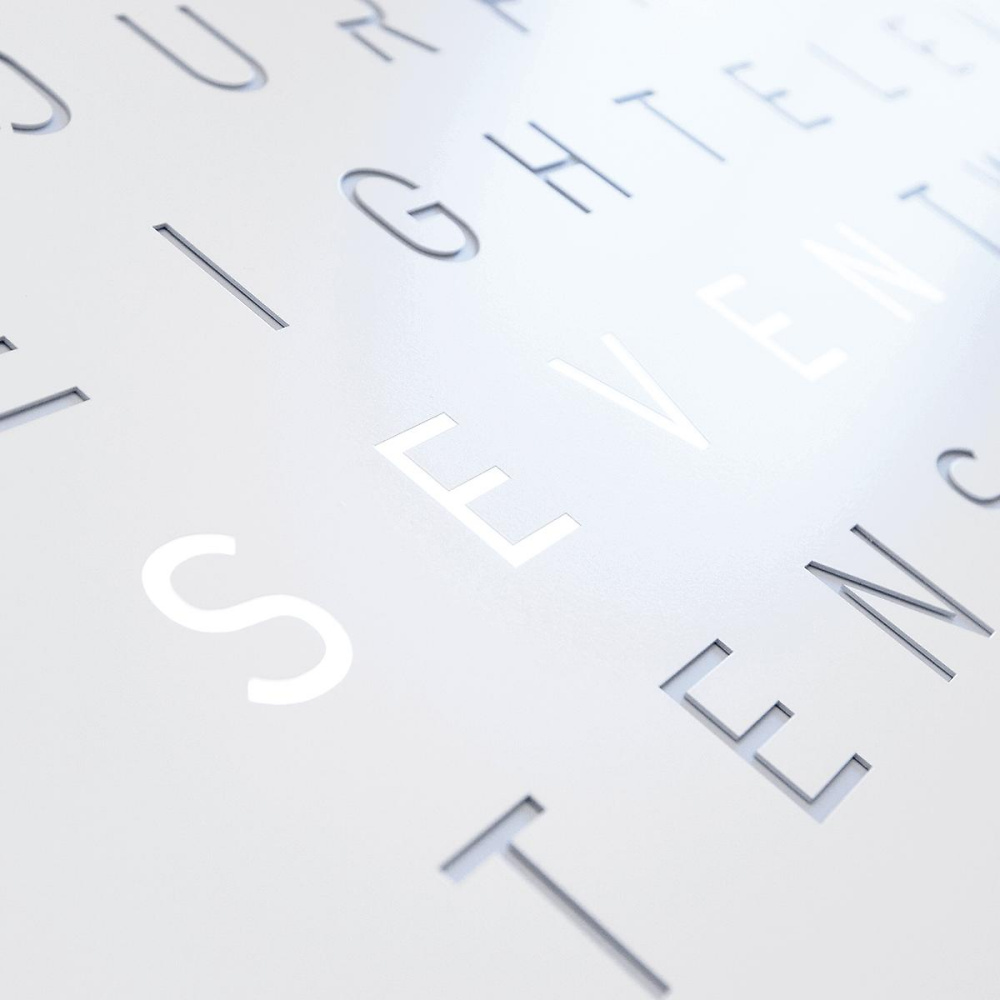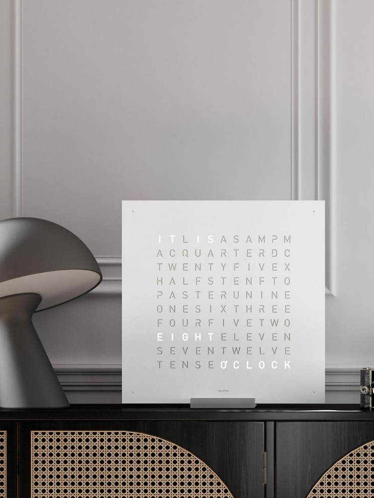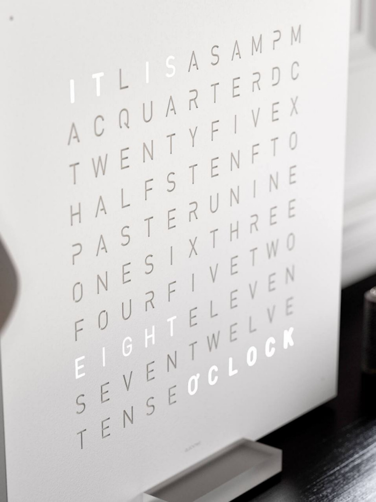 OHNE ZEIGER. OHNE ZIFFERN.Die QLOCKTWO EARTH ist eine Hommage an das einzigartige Kulturgut Zeit und unseren Planeten. Sie zeigt die 24 Stunden eines Tages auf einer Wortmatrix in den Sprachen unserer Welt an. Durch die aufwendige Beschichtung erhält das Frontpanel der EARTH 45 WHITE PEPPER ein exklusives, mattes Oberflächenfinish. Die ausgelaserten Buchstaben der ikonischen Matrix lassen das Licht in eindrucksvoller Präsenz erscheinen. Die Dreidimensionalität der Oberfläche wird hierdurch noch einmal verstärkt. Die 45 x 45 cm grosse EARTH 45 verleiht, ob an der Wand oder im Standfuss, jedem Raum ein einzigartiges, edles Ambiente.
