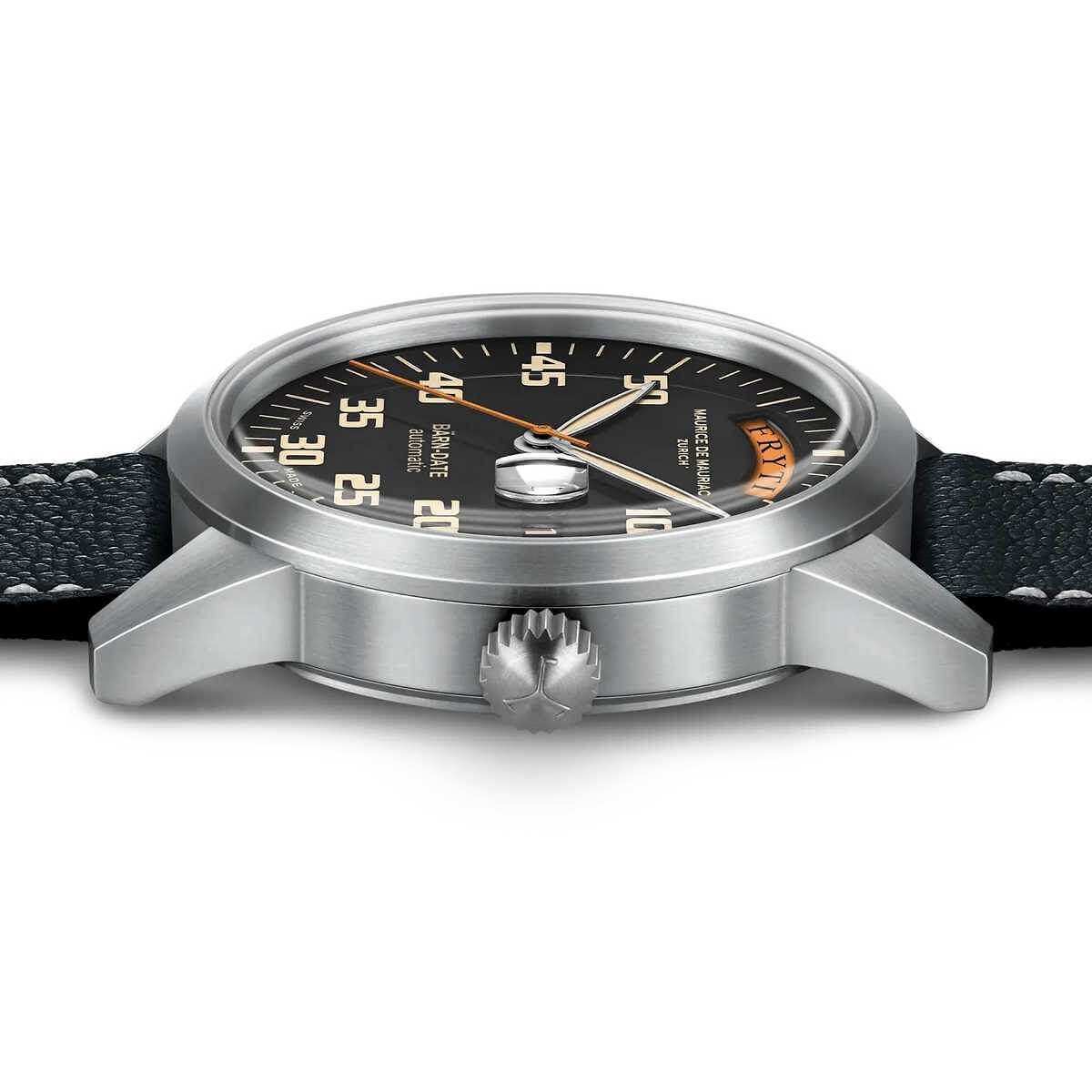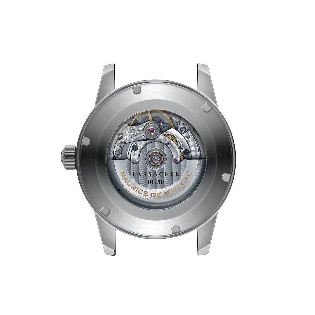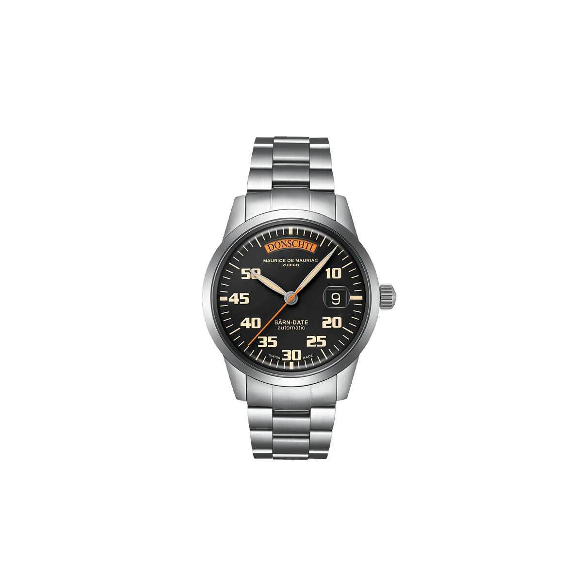 Materialien Gehäuse aus satiniertem Edelstahl, schwarzes Zifferblatt mit Sekundenzeiger und Wochentags-Anzeige in UhRSACHEN-Orange, geschützt durch ein blau entspiegeltes Saphirglas, Saphirglas-Sichtboden. Folgende Armbandmöglichkeiten stehen zur Auswahl: Lederband mit Dornschliesse aus Edelstahl, Edelstahl-Milanaiseband mit Sicherheitsschliesse oder Edelstahlband mit Drückerfaltschliesse.