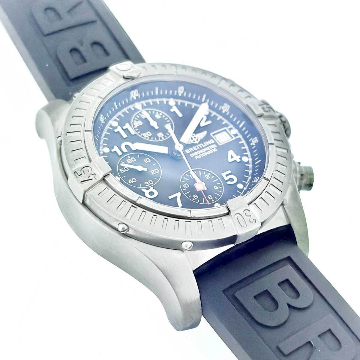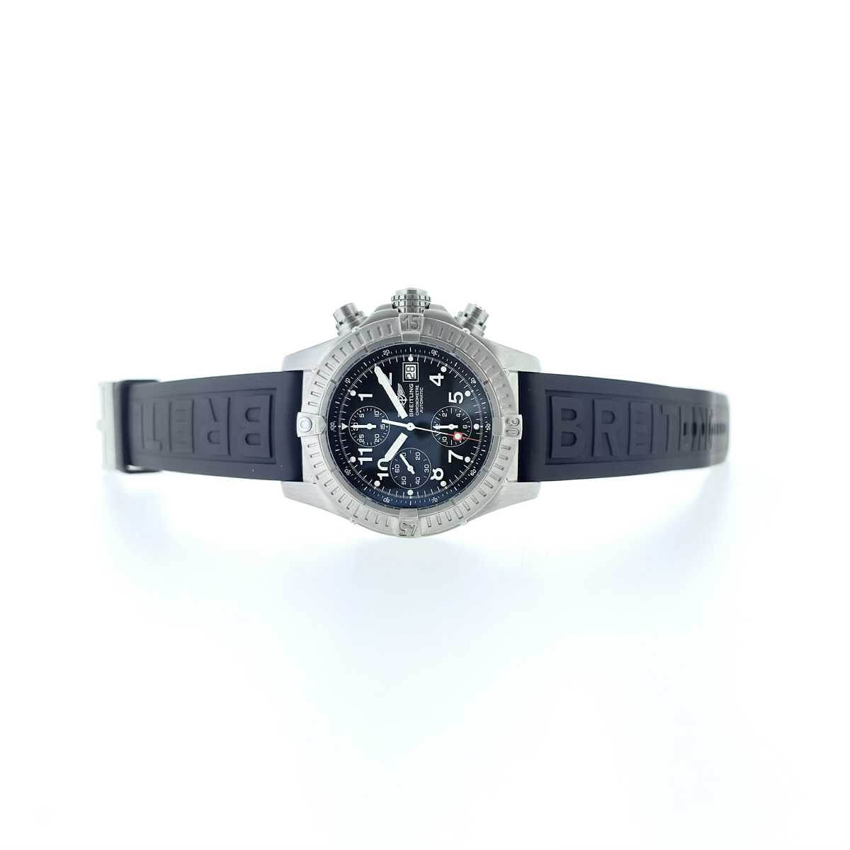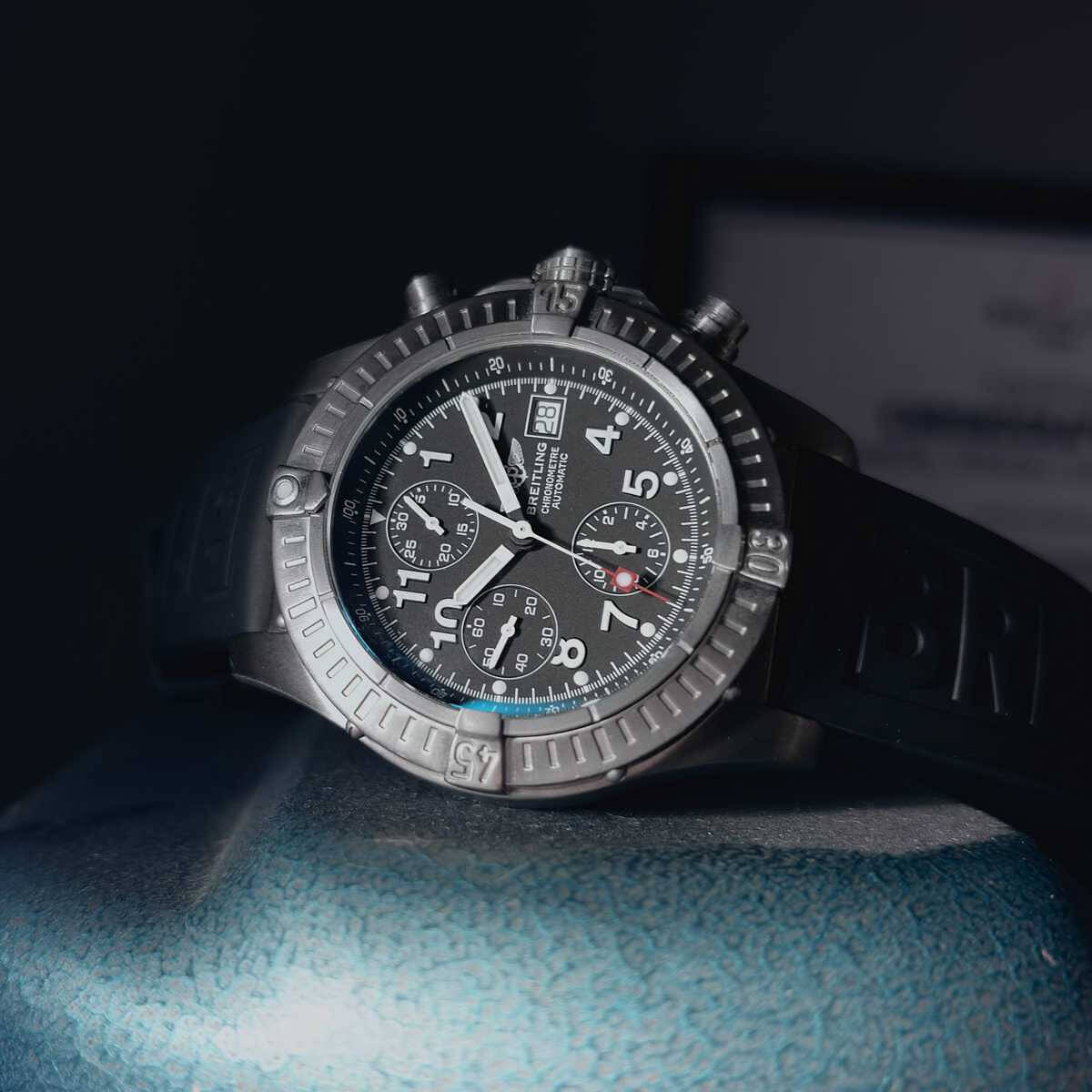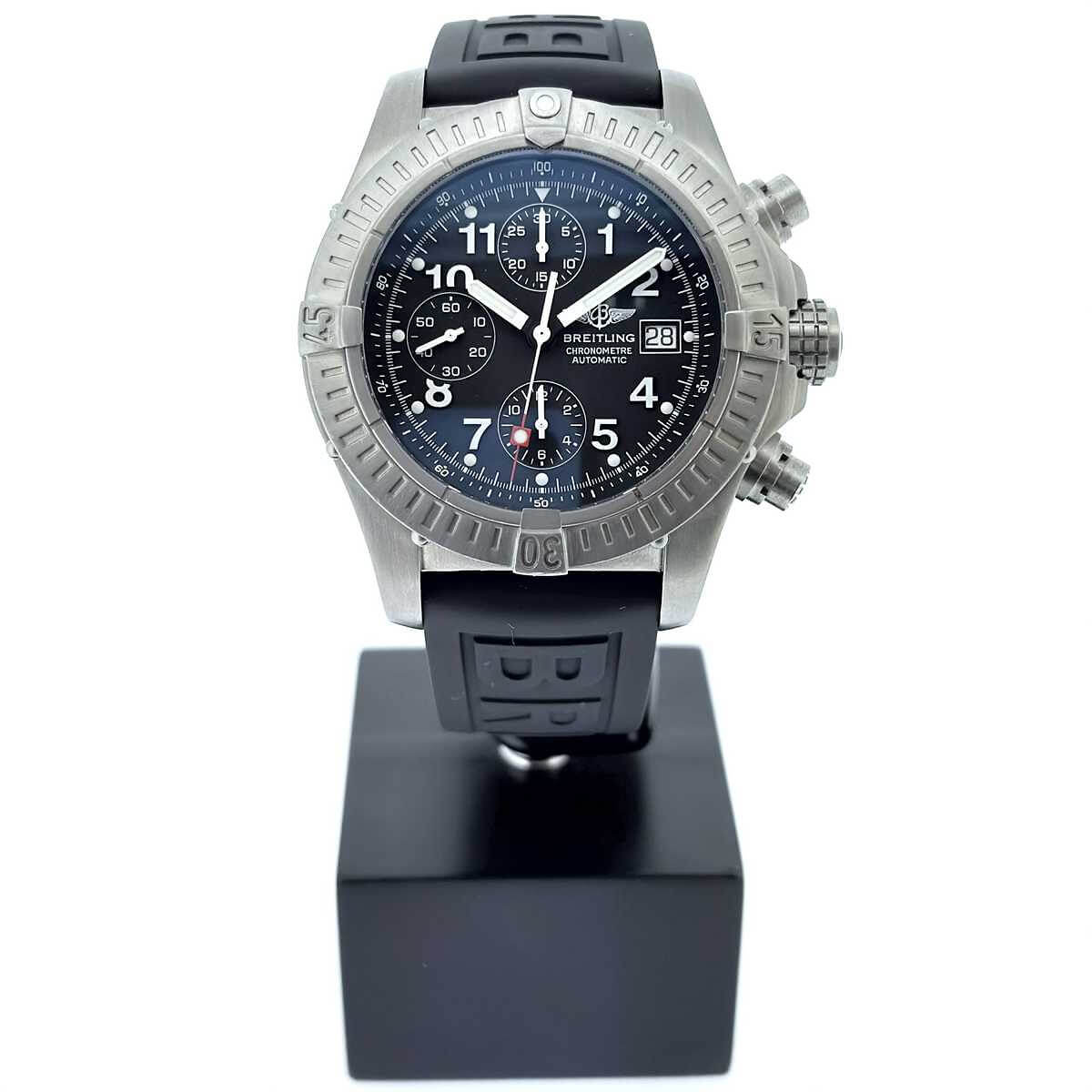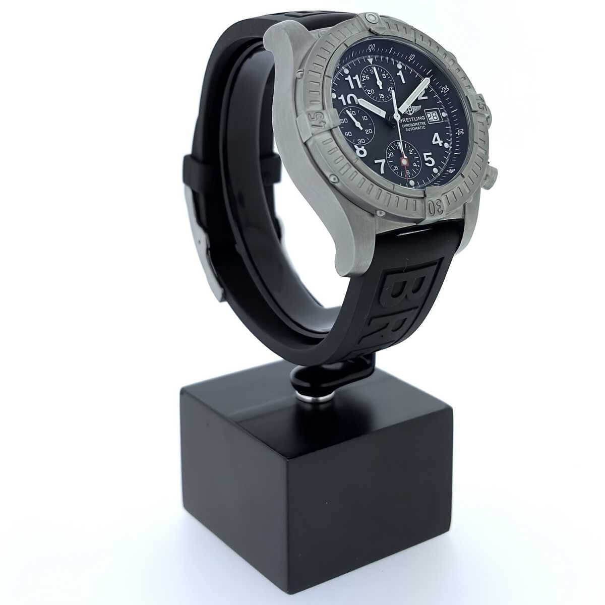 Marke BREITLING Modell Avenger Referenz E13360 Produktionsjahr ca. 2004 Dimensionen 44mm Materialien Gehäuse aus Titan mit schwarzem Zifferblatt, geschützt durch ein Saphirglas, begleitet von einem Kautschukband mit Dornschliesse aus Edelstahl Kaliber Mechanisches Chronometeruhrwerk mit automatischem Aufzug Funktionen Anzeige der Stunden, Minuten und Sekunden inkl. Chronographenfunktion und Datumsanzeige Zustand Frisch revidiert