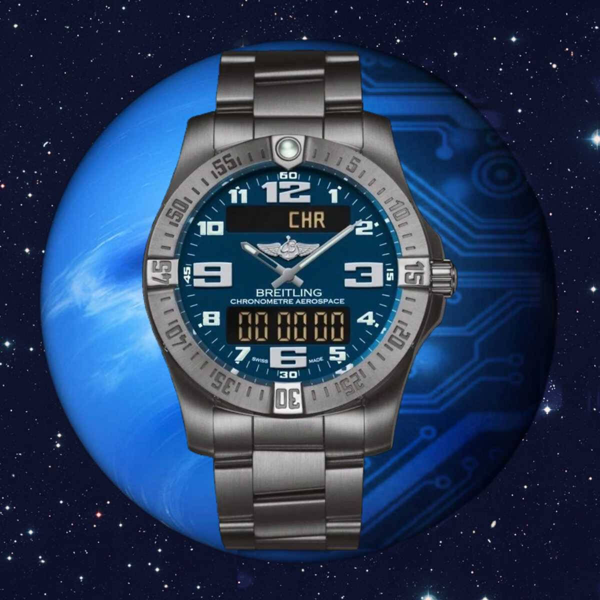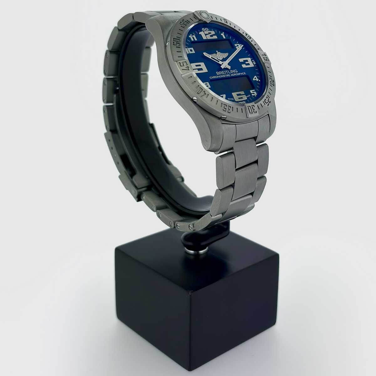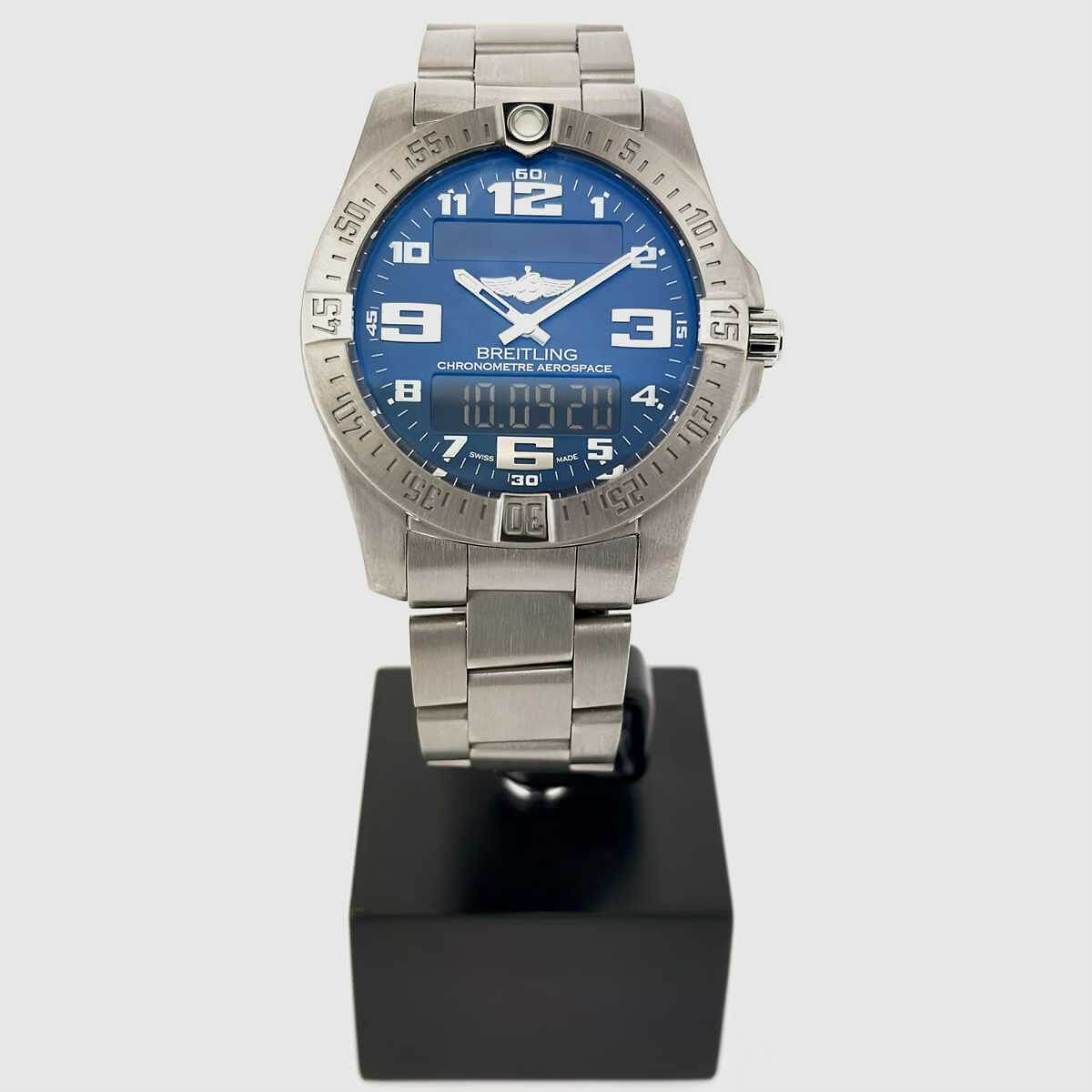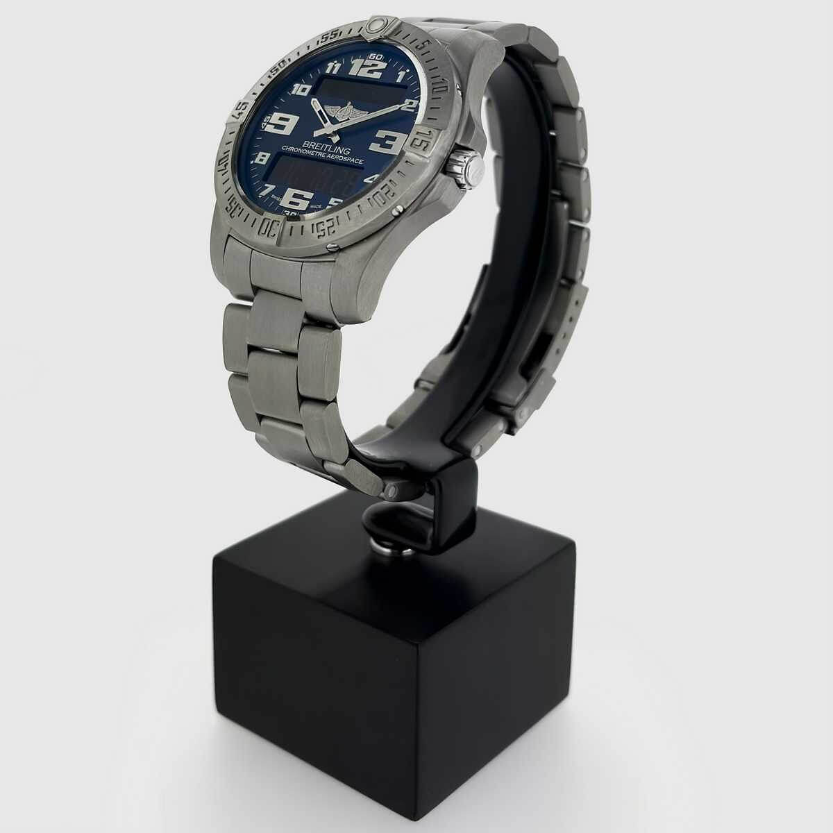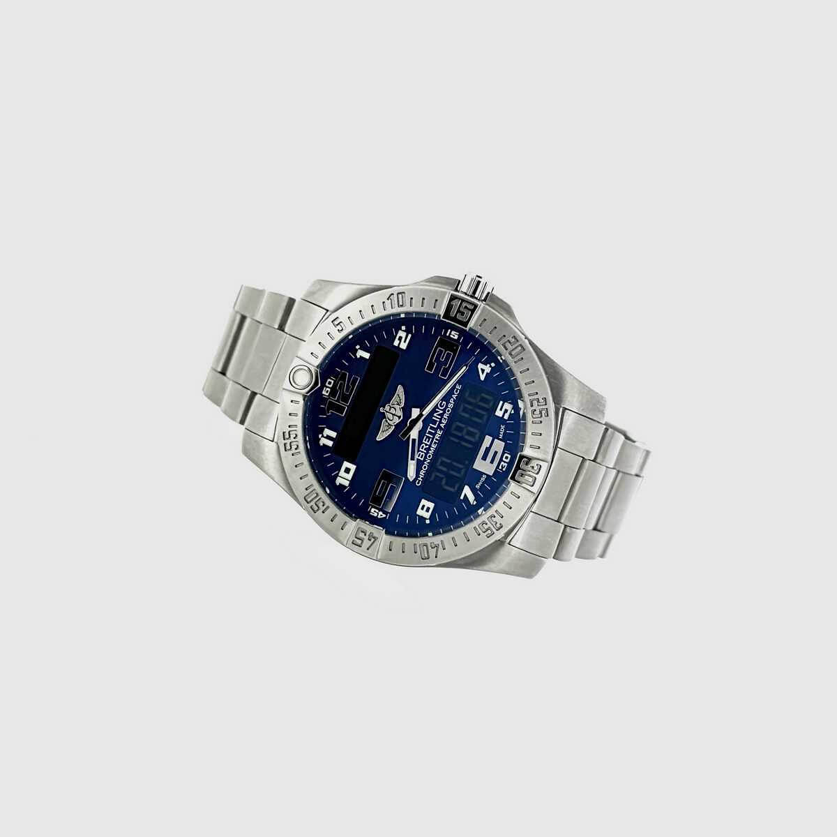 Navitimer Aerospace EVOThe Aerospace EVO appears in a noticeably more powerful and dynamic design. The slightly increased case diameter gives the watch greater presence, while the engraved bezel, redesigned numerals and distinctive hands enhance legibility. The sloped sapphire crystal with double-sided anti-reflective coating emphasizes the technical and functional character of the watch. The fully satin-finished titanium case is lightweight, robust and suitable for both everyday wear and demanding conditions. Inside operates the thermocompensated SuperQuartz chronometer movement, caliber B79, offering up to ten times the accuracy of conventional quartz movements. The combination of analog display and digital functions is clearly structured and intuitive to use. Chronograph, timer, UTC display, perpetual calendar and alarm are easily controlled by turning, pressing or pulling the crown. The blue dial adds a sporty, technical appearance, while the satin-finished professional titanium bracelet with titanium folding clasp ensures a secure fit and high wearing comfort. With a water resistance of 10 bar, the watch is a reliable companion for daily use and travel alike. A modern instrument watch for those who value precision, functionality and a clear, purposeful design.