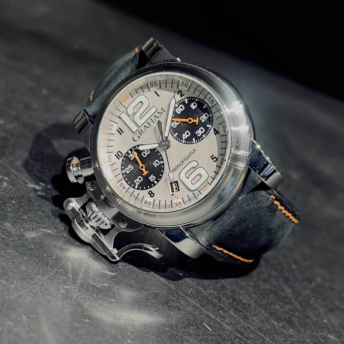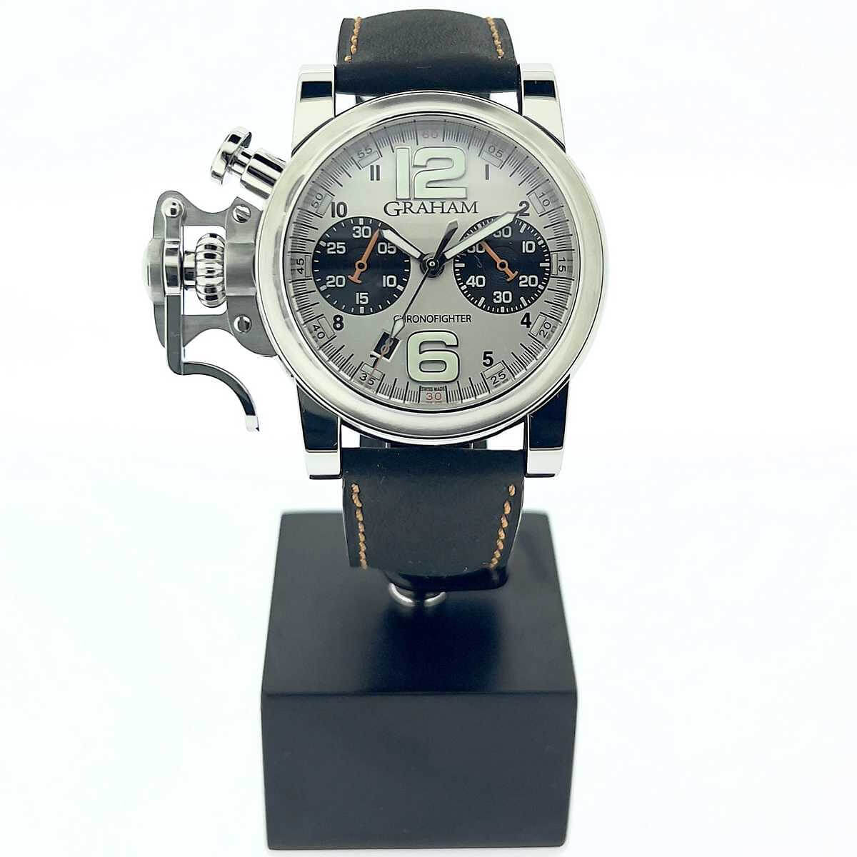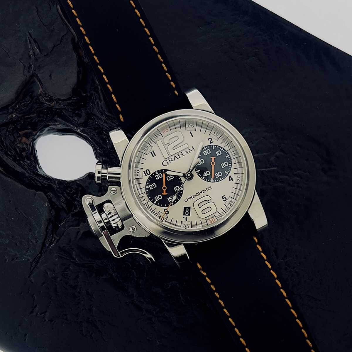 Chronofighter R.A.C Silver FighterThe Graham Chronofighter dates back to the English watchmaker George Graham, who was a significant innovator in the 18th century and developed, among other things, the first functional chronograph. The brand was re-established in Switzerland in the late 1990s to continue this legacy. Particularly well known is the Chronofighter collection, which was introduced in 2001 and features a distinctive side-mounted chronograph trigger lever inspired by aviator and military watches of the 1930s and 1940s. The Chronofighter R.A.C Silver Fighter from 2009 combines this historic design element with modern technology and a striking appearance. The watch has a striking 43-millimetre case and a silver-plated dial accentuated by black totalisers and protected by sapphire crystal. The sporty, elegant appearance is complemented by a black calfskin strap with a stainless steel buckle. Inside, a mechanical movement with automatic winding provides hour, minute and second displays, as well as a precise chronograph function and a date display. The watch has been freshly serviced and combines the characteristic style of the Graham Chronofighter line with technical reliability and sporty elegance.