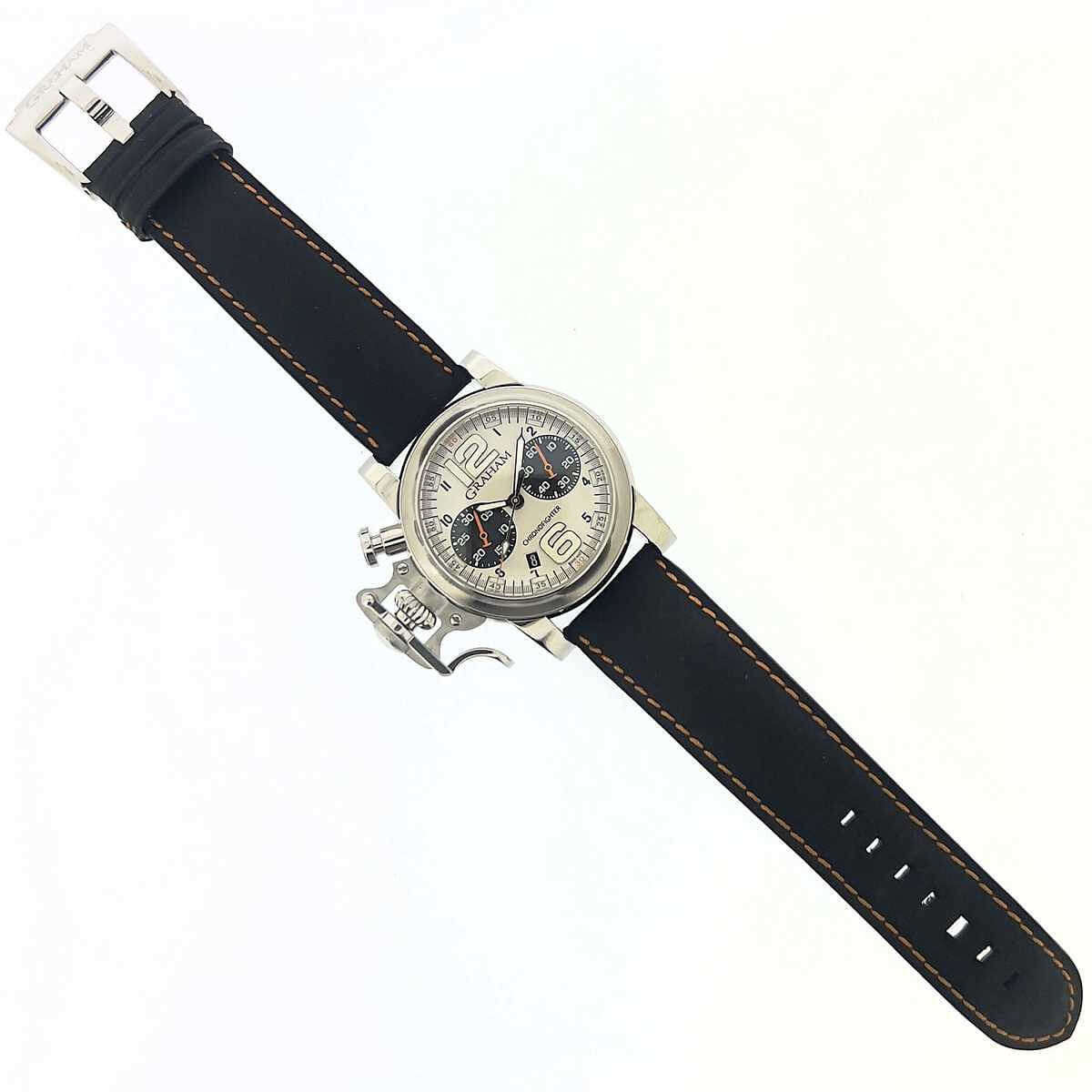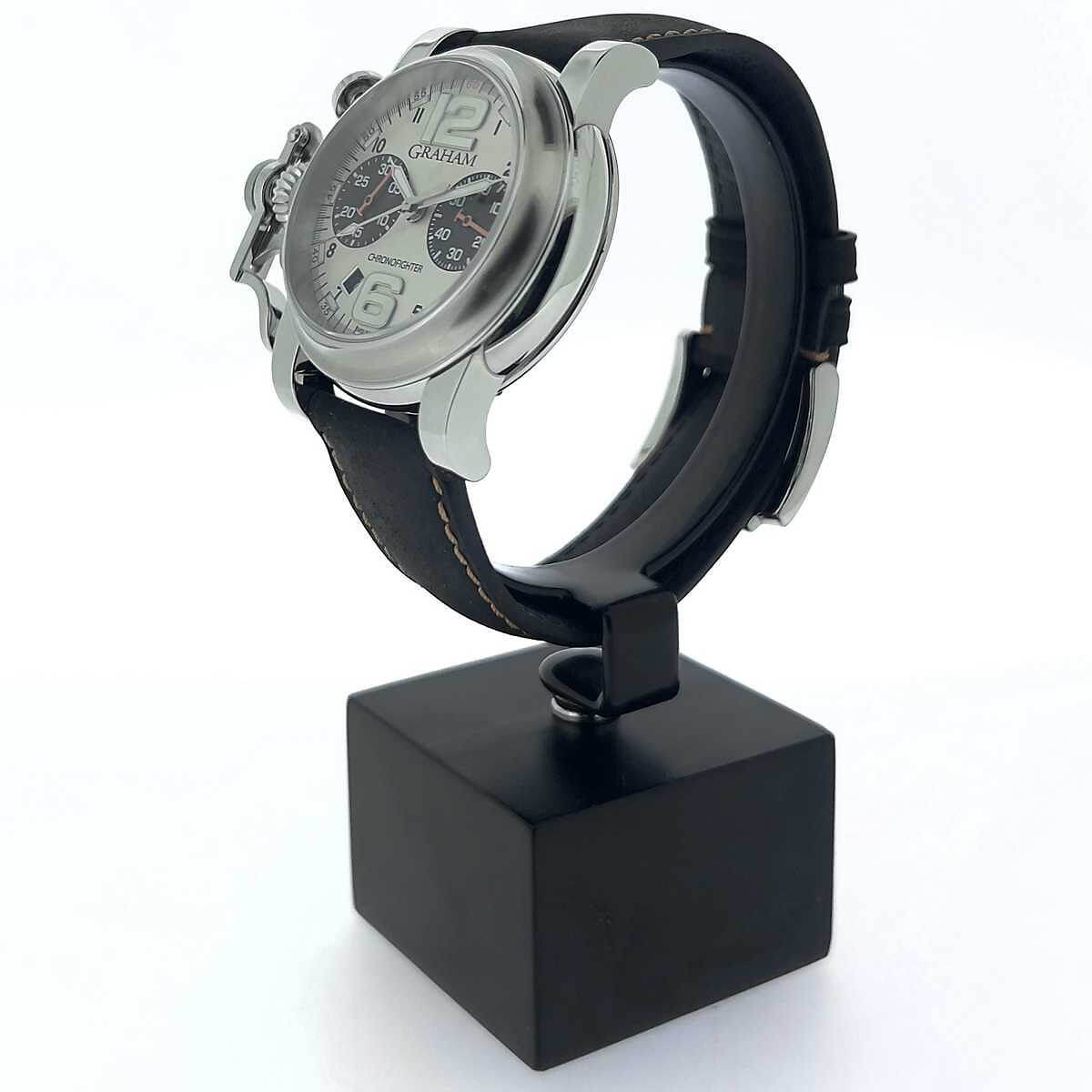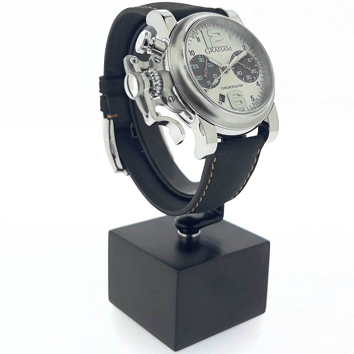 Chronofighter R.A.C Silver FighterThe Graham Chronofighter dates back to the English watchmaker George Graham, who was a significant innovator in the 18th century and developed, among other things, the first functional chronograph. The brand was re-established in Switzerland in the late 1990s to continue this legacy. Particularly well known is the Chronofighter collection, which was introduced in 2001 and features a distinctive side-mounted chronograph trigger lever inspired by aviator and military watches of the 1930s and 1940s. The Chronofighter R.A.C Silver Fighter from 2009 combines this historic design element with modern technology and a striking appearance. The watch has a striking 43-millimetre case and a silver-plated dial accentuated by black totalisers and protected by sapphire crystal. The sporty, elegant appearance is complemented by a black calfskin strap with a stainless steel buckle. Inside, a mechanical movement with automatic winding provides hour, minute and second displays, as well as a precise chronograph function and a date display. The watch has been freshly serviced and combines the characteristic style of the Graham Chronofighter line with technical reliability and sporty elegance.
