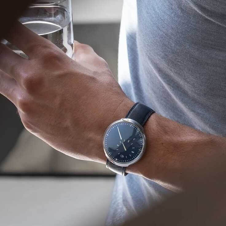 Type 8Die Type 8 Cobalt Blue verkörpert die Essenz dessen, was Ressence seit seiner Gründung auszeichnet: die Idee, Zeit nicht nur zu messen, sondern sie zu erleben. Statt klassischer Zeiger kreisen auf dem tiefblauen, konvexen Zifferblatt harmonisch rotierende Scheiben – ein bewegtes Schauspiel, das den Moment greifbar macht. Im Inneren arbeitet das patentierte ROCS 8-System (Ressence Orbital Convex System), das über die Minutenachse eines modifizierten Kalibers 2892/2 angetrieben wird. Diese einzigartige Mechanik lässt die Zeit in fliessender Bewegung erscheinen. Das Gehäuse aus Titan Grade 5 unterstreicht die Leichtigkeit der Konstruktion. Polierte und satinierte Flächen wechseln sich ab, während das beidseitig entspiegelte Saphirglas den Blick auf das kobaltblaue Zifferblatt freigibt. Mit nur 11 Millimetern Höhe und ohne klassische Krone wirkt die Uhr wie ein organisches Ganzes – technisch anspruchsvoll, aber von bemerkenswerter Schlichtheit. Jedes Detail ist auf intuitive Bedienung und Tragekomfort ausgelegt: Die Einstellung erfolgt über den Gehäuseboden, die Zeit wird durch sanfte Drehbewegungen verändert. Getragen wird die Uhr an einem blauen Lederarmband mit Titan-Dornschliesse – eine dezente Ergänzung zum puristischen Design. Die Type 8 Cobalt Blue steht für eine neue Art des Uhrenerlebnisses. Eine Uhr, die Mechanik sichtbar macht, ohne sie zu inszenieren. Eine Form, die auf das Wesentliche reduziert ist – und gerade darin ihre Faszination entfaltet. Im Lieferumfang enthalten ist ein Swiss Kubik Uhrenbeweger (Startbox) in Schwarz.