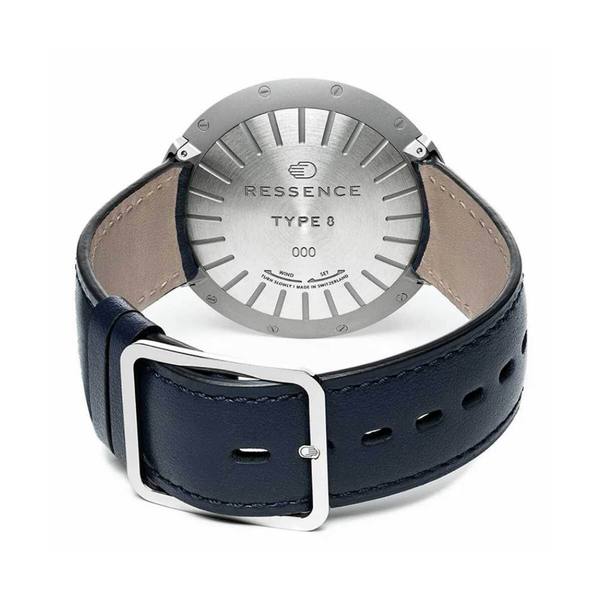Type 8El Type 8 Cobalt Blue refleja la esencia de Ressence desde sus inicios: no se trata solo de medir el tiempo, sino de sentirlo. En lugar de las agujas tradicionales, su esfera convexa de un profundo azul cobalto muestra discos que giran suavemente, creando un movimiento continuo que hace visible el paso del tiempo. En su interior funciona el sistema patentado ROCS 8 (Ressence Orbital Convex System), impulsado por un calibre 2892/2 modificado. Gracias a esta mecánica especial, el tiempo se percibe como un flujo constante. La caja de titanio de grado 5 resalta la ligereza del reloj. Sus superficies alternan entre pulidas y satinadas, mientras el cristal de zafiro antirreflectante en ambos lados deja ver la esfera azul. Con solo 11 milímetros de grosor y sin corona tradicional, el reloj se siente orgánico y minimalista, técnico pero sorprendentemente simple. Cada detalle está pensado para ofrecer uso intuitivo y comodidad: el ajuste se hace desde la parte trasera de la caja, girándola suavemente para cambiar la hora. Se acompaña con una correa de cuero azul y una hebilla de titanio, siguiendo el diseño puro y elegante del conjunto. El Type 8 Cobalt Blue propone una nueva manera de vivir la relojería: un reloj que muestra su mecánica sin ostentación, centrado en lo esencial, y que precisamente por eso atrae y fascina. El paquete incluye un rotor de cuerda Swiss Kubik (Startbox) en color negro.