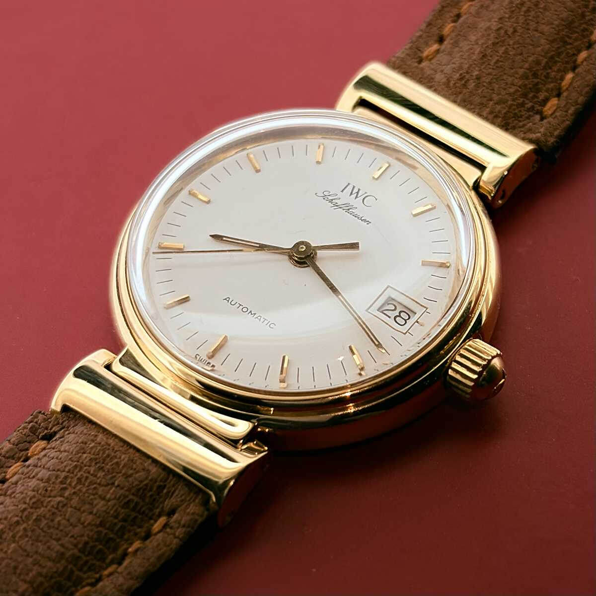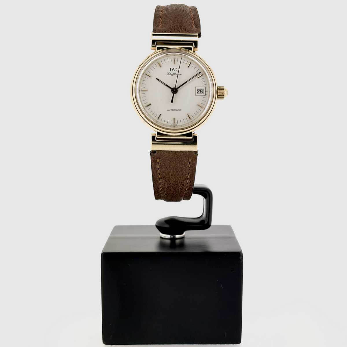 Da Vinci AutomaticThis elegant wristwatch from IWC features a 26 mm case crafted in solid 18K yellow gold, offering refined proportions and a timeless presence on the wrist. The white dial is clean and balanced in design, protected by a scratch-resistant sapphire crystal. Inside, the mechanical Caliber 320-1 with automatic winding ensures reliable performance. It displays hours, minutes and seconds, complemented by a practical date function. The watch is fitted with a brown leather strap and a coated gold-tone pin buckle, perfectly matching the warmth of the yellow gold case. Freshly serviced and in very well-maintained condition, this timepiece is ready to wear and suitable for both everyday elegance and special occasions.