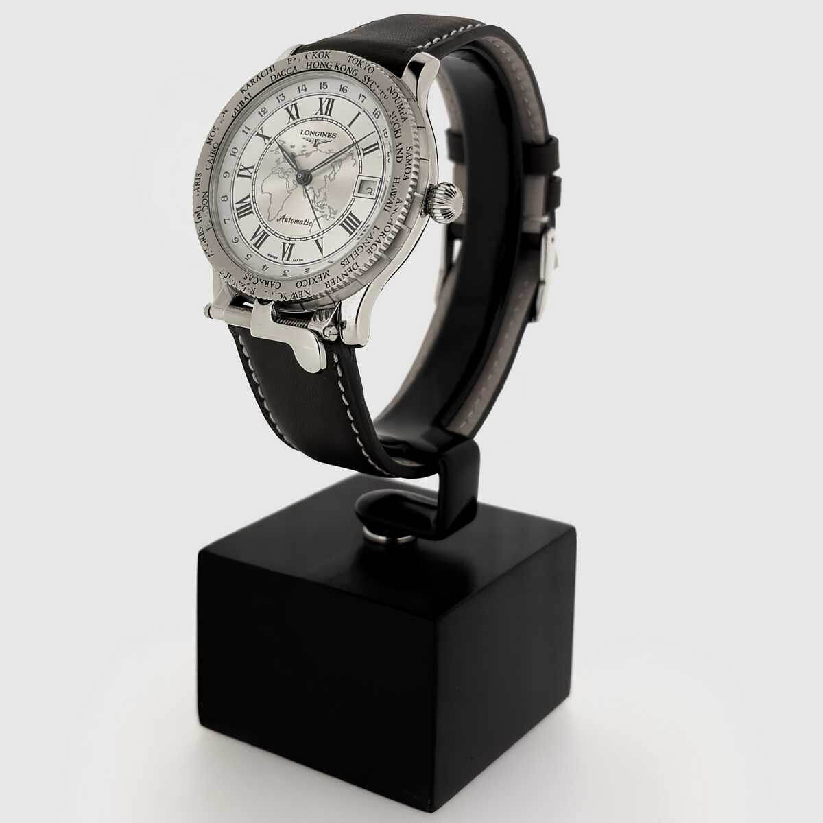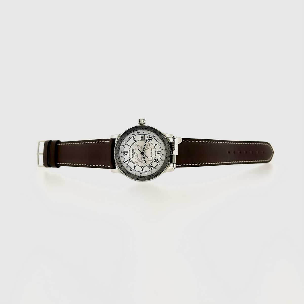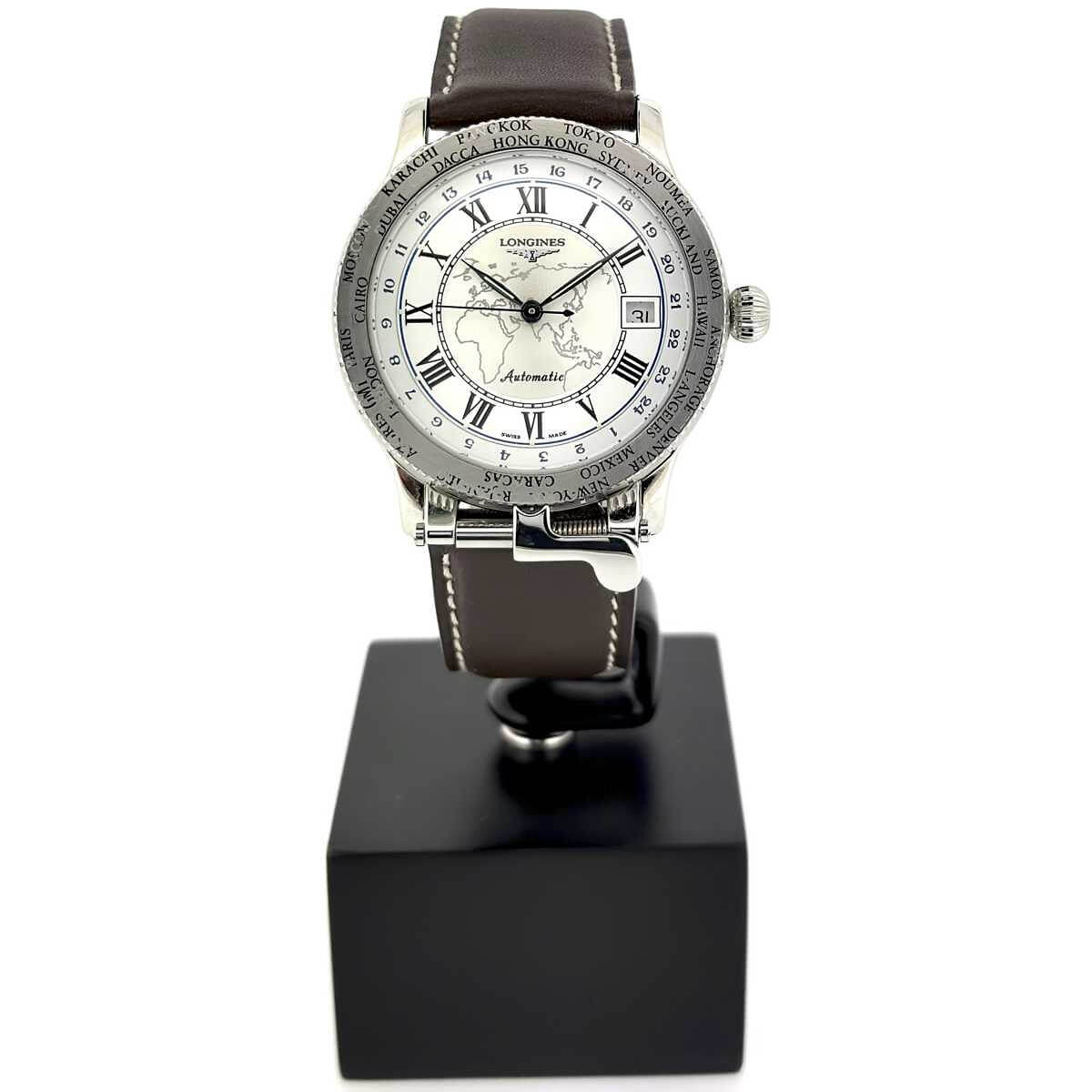 Marke LONGINES Modell Lindbergh GMT Referenz L2.610.4 Produktionsjahr ca. 1998 Dimensionen 38mm Materialien Gehäuse aus Edelstahl mit hellem Zifferblatt, geschützt durch ein Saphirglas, begleitet von einem braunen Kalbslederband mit Dornschliesse aus Edelstahl