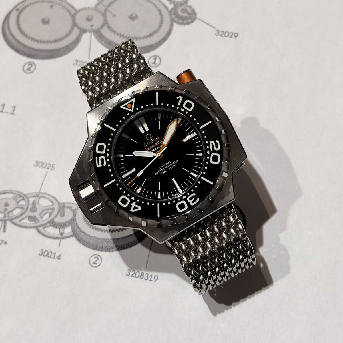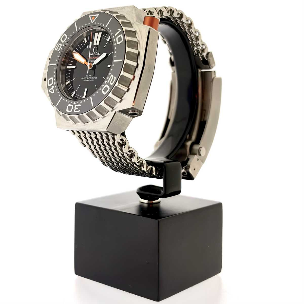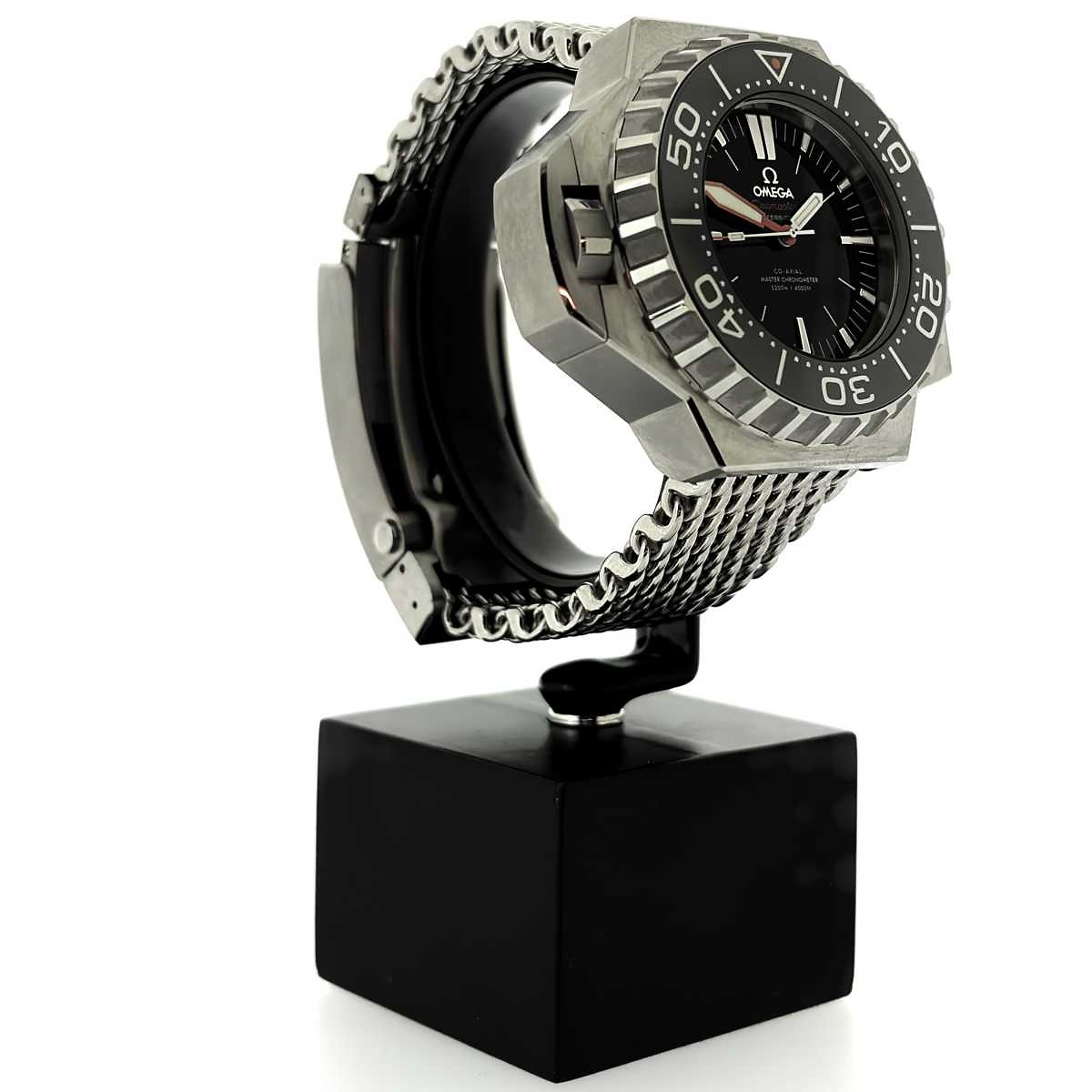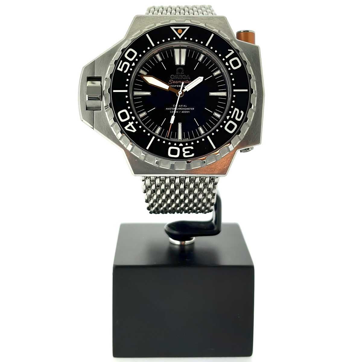 Marke OMEGA Modell Seamaster Ploprof Referenz 227.90.55.21.01.001 Produktionsjahr 2023 Dimensionen 43mm x 55mm Materialien Gehäuse aus Titan mit schwarzem Zifferblatt, geschützt durch ein Saphirglas. Lünette und Sichtboden jeweils aus Saphirglas. Milanaise-Armband mit Faltschliesse und Tauchverlängerung jeweils aus Titan. Kaliber Mechanisches Master-Chronometeruhrwerk mit COSC- und METAS- zertifiziertem Co-Axial-Manufaktur-Kaliber 8912 Funktionen Anzeige der Stunden, Minuten und Sekunden Zustand Neuwertig