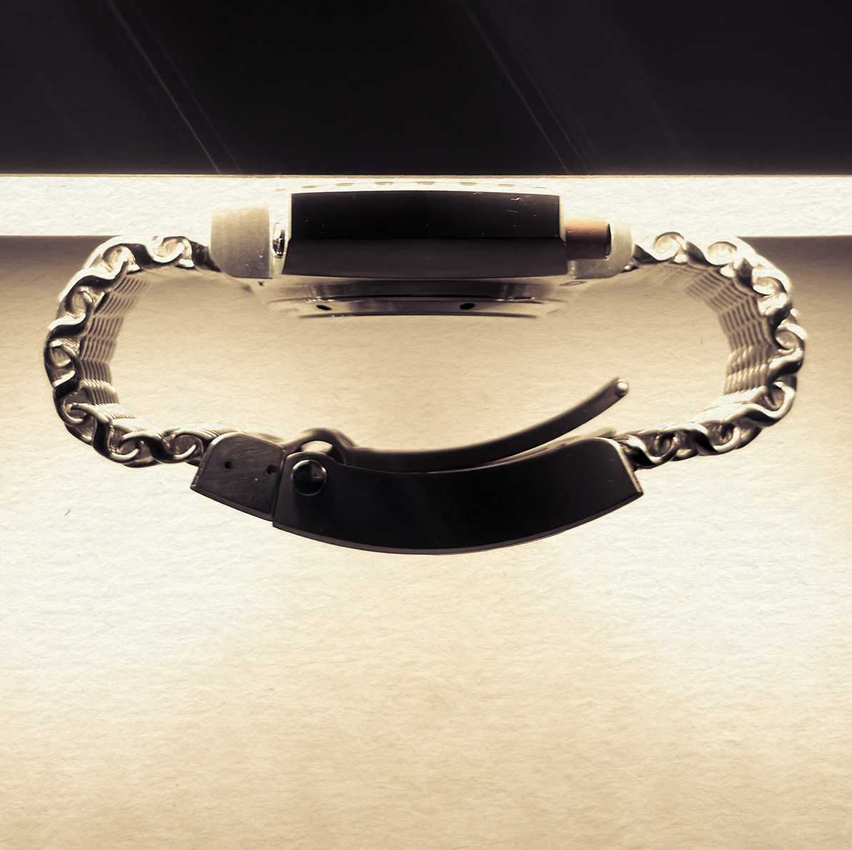La lunette en céramique noire polie, qui couronne le boîtier unique, est dotée de chiffres, d'un triangle et d'une échelle des minutes remplis de Super-LumiNova, ce qui améliore la lisibilité. Le boîtier et la boucle sont fabriqués en titane Grade 5, un matériau léger, et le cadran noir laqué est équipé de aiguilles en aluminium orange et peintes en blanc. Le design sombre et classique de cette montre est prêt pour les profondeurs de la mer, et le bracelet Milanese "Sharkproof" en titane Grade 2 poli souligne une fois de plus le caractère d'explorateur et d'aventurier de la montre.