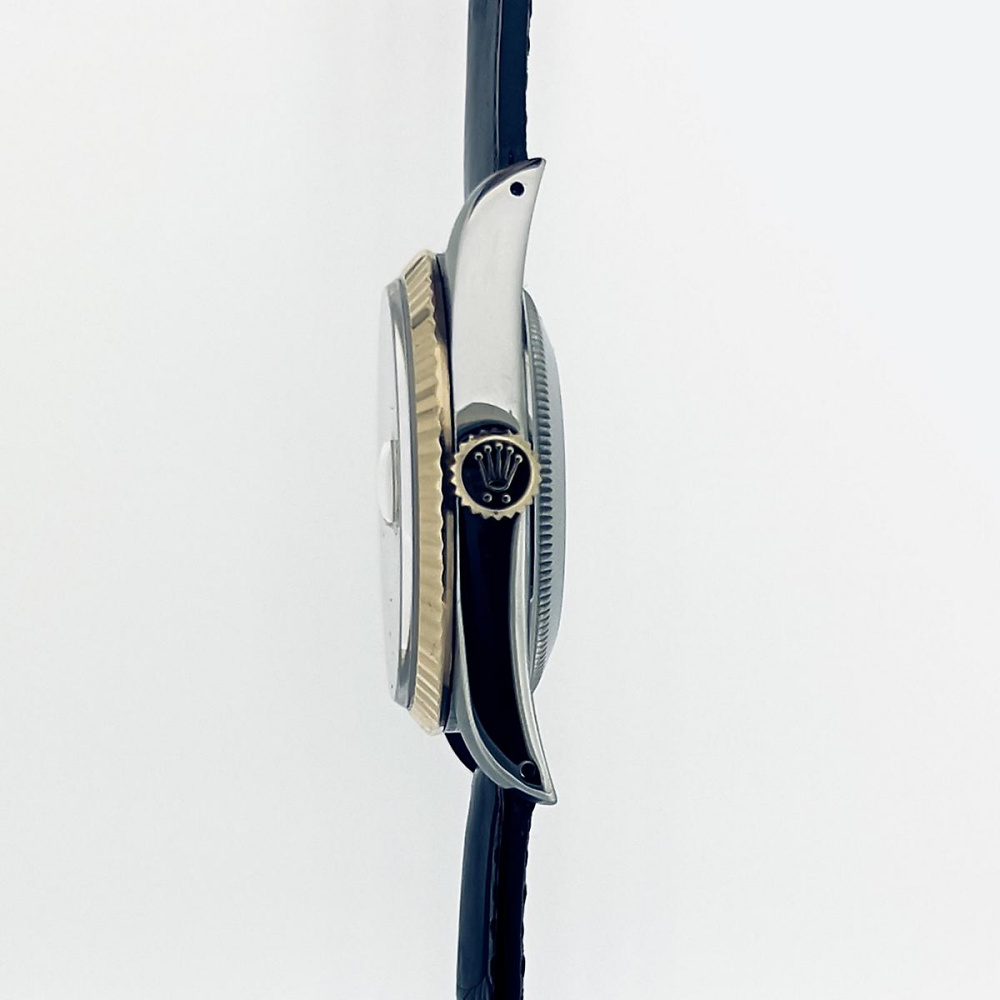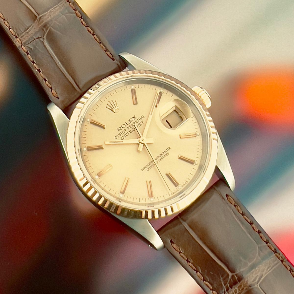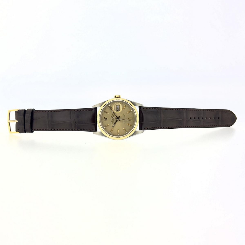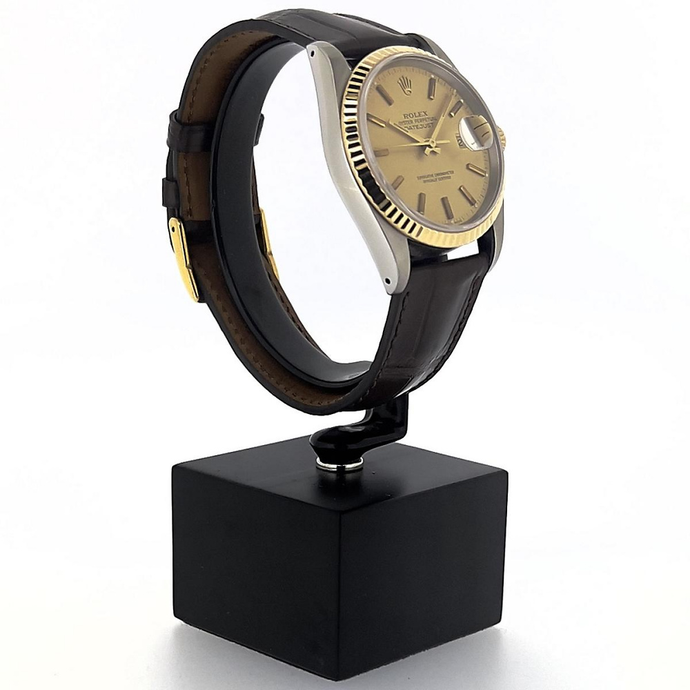 Gehäuse aus Edelstahl und geriffelte Lünette aus 18K Gelbgold (Rolesor), vergoldetes Zifferblatt mit Saphirglas, braunes Alligatorband mit beschichteter Dornschliesse aus Edelstahl