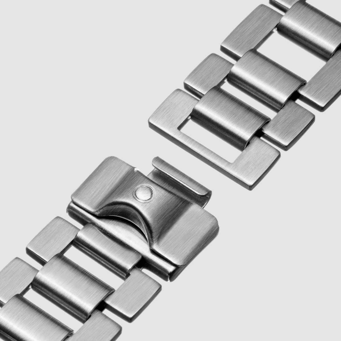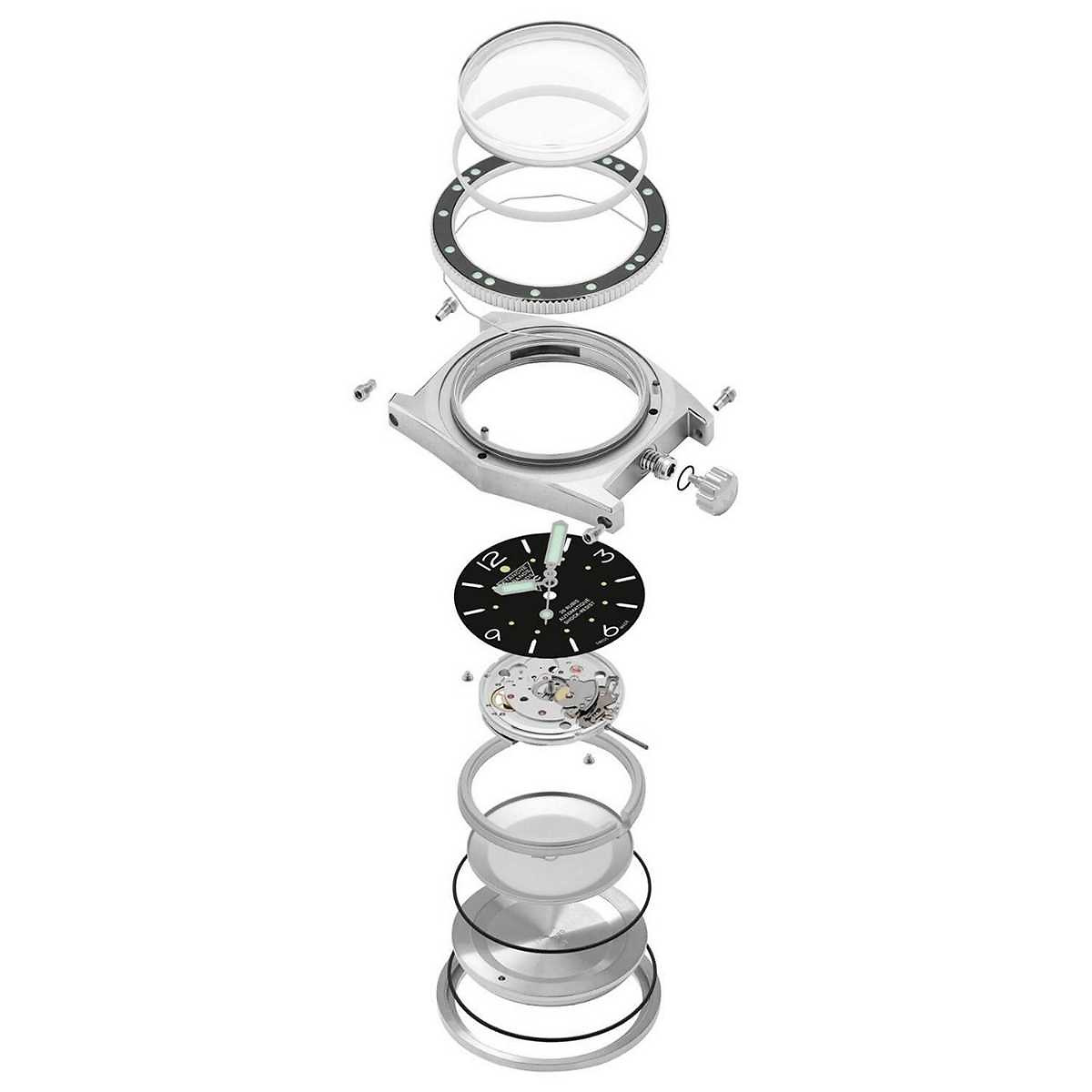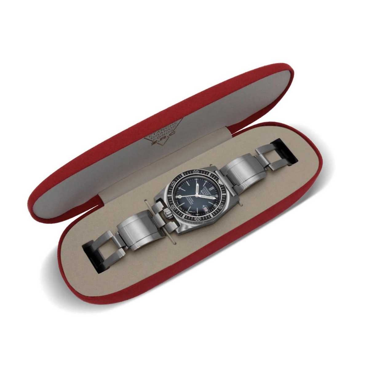 Monobloc-Gehäuse aus Edelstahl mit verschraubtem Gehäuseboden und Krone aus Edelstahl, Armband ebenso aus Edelstahl. Wasserdichtigkeit bei verschraubter Krone garantiert bis 30 Bar.