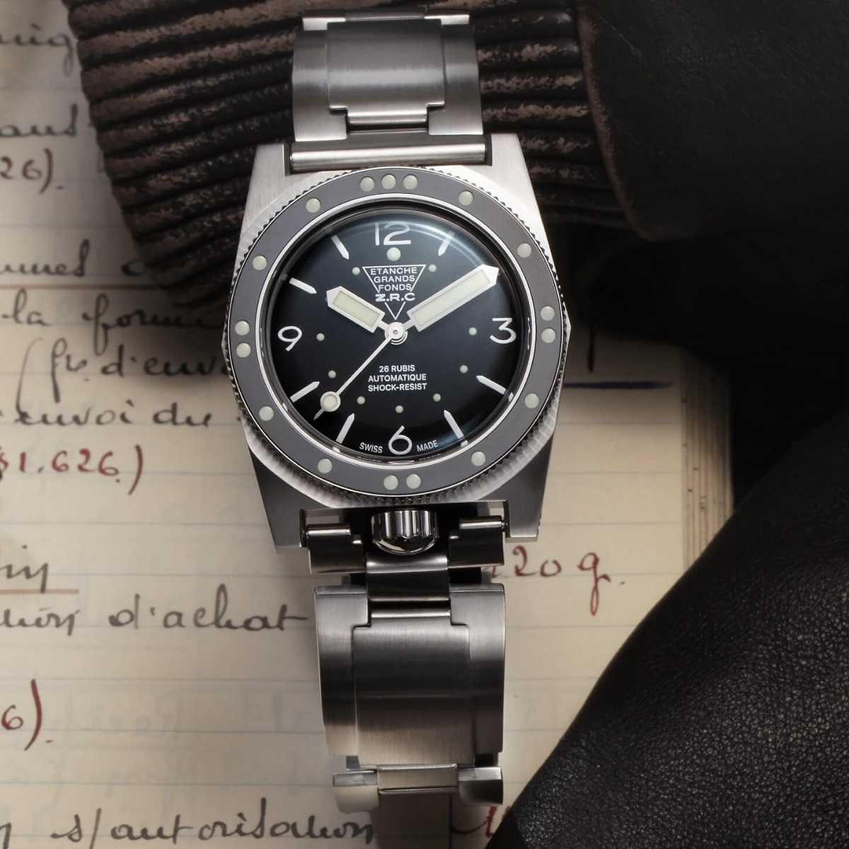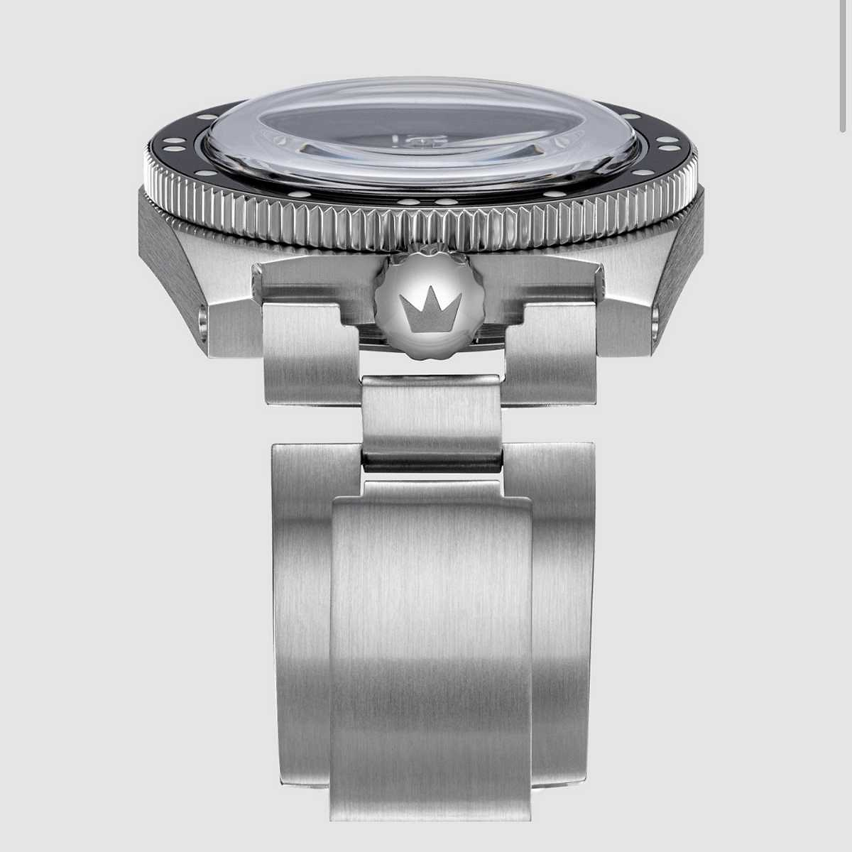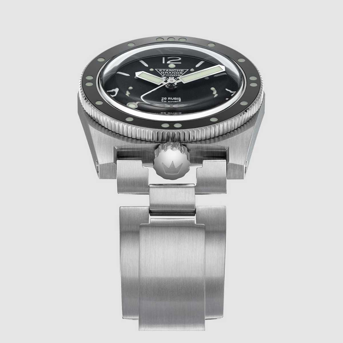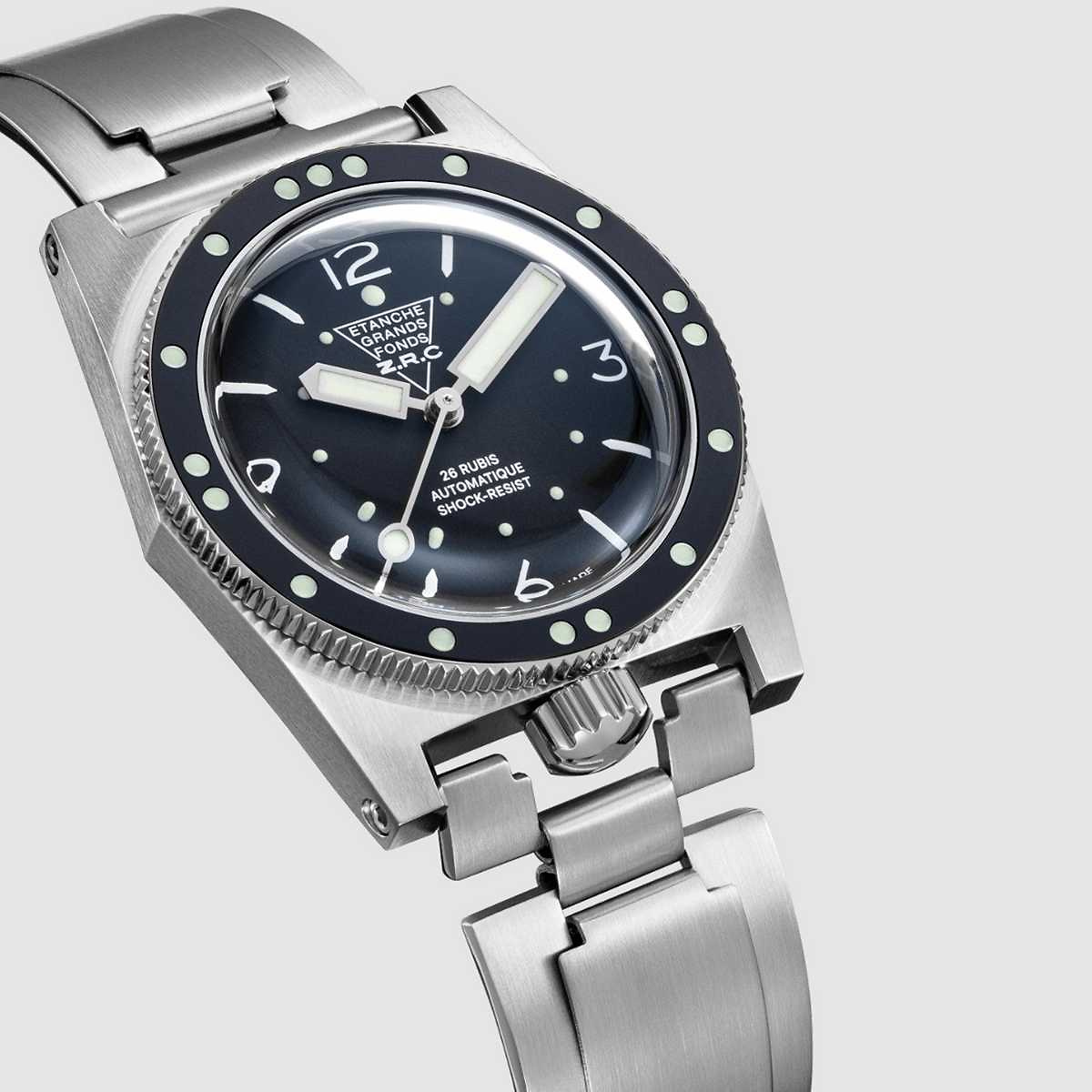Sie ist mehr als eine Taucheruhr, denn mit ihrem kühnen und zeitlosen Design hat dieses Modell alle Voraussetzungen, ein alltäglicher Begleiter für Männer und Frauen zu werden. Das schlichte, gewölbte Zifferblatt, die Zeiger im Magnum-Stil, der Stundenkreis und die minimalistische Lünette verleihen ihr eine facettenreiche Persönlichkeit. Das bequeme Stahlarmband der GF38163 – S2 unterstreicht ihren eleganten Charakter, indem es die markanten Linien des ikonischen sechseckigen Stahlgehäuses perfekt ergänzt. Wie bei allen ZRC®-Uhren sorgt das moderne Design für ultimative Wasserdichtigkeit und beinhaltet die neuesten Innovationen in der programmierten Verformung von Materialien. Das ECS ™ ist eine technische Lösung für ein Problem, mit dem sich die Minentaucher der Marine Nationale während ihrer vielen Tauchgänge befassen: Salz kristallisiert in den Zwischenräumen zwischen der Lünette und dem Gehäuse und behindert so dessen Rotation. Für die Neuauflage des Grands Fonds 300 im Jahr 2015 hat ZRC eine funktionale Lösung entwickelt und patentiert – das ECS™. Es ist dies ein einzigartiges System zur Reinigung des Inneren der Frontblende durch zirkulierendes frisches Wasser, welches das Meersalz verdünnt und gleichzeitig abführt. Dank dieses exklusiven Bandsystems mit einziehbaren Ösen ist 100%-ige Sicherheit garantiert. Dadurch wird es verunmöglicht, die Uhr im Wasser zu tragen, ohne dass die Krone wieder in ihre ursprüngliche Position verschraubt ist. Dies wird dadurch ermöglicht, dass sofern die Krone nicht sicher verschraubt sein sollte, das Band nicht richtig positioniert werden kann und ein Tragen der Uhr verhindert wird. Diese effektive Methode garantiert nicht, dass die Uhr in unverschraubtem Zustand nicht getragen werden kann, sondern zugleich auch, dass sich die Krone in getragenem Zustand nicht lösen kann.