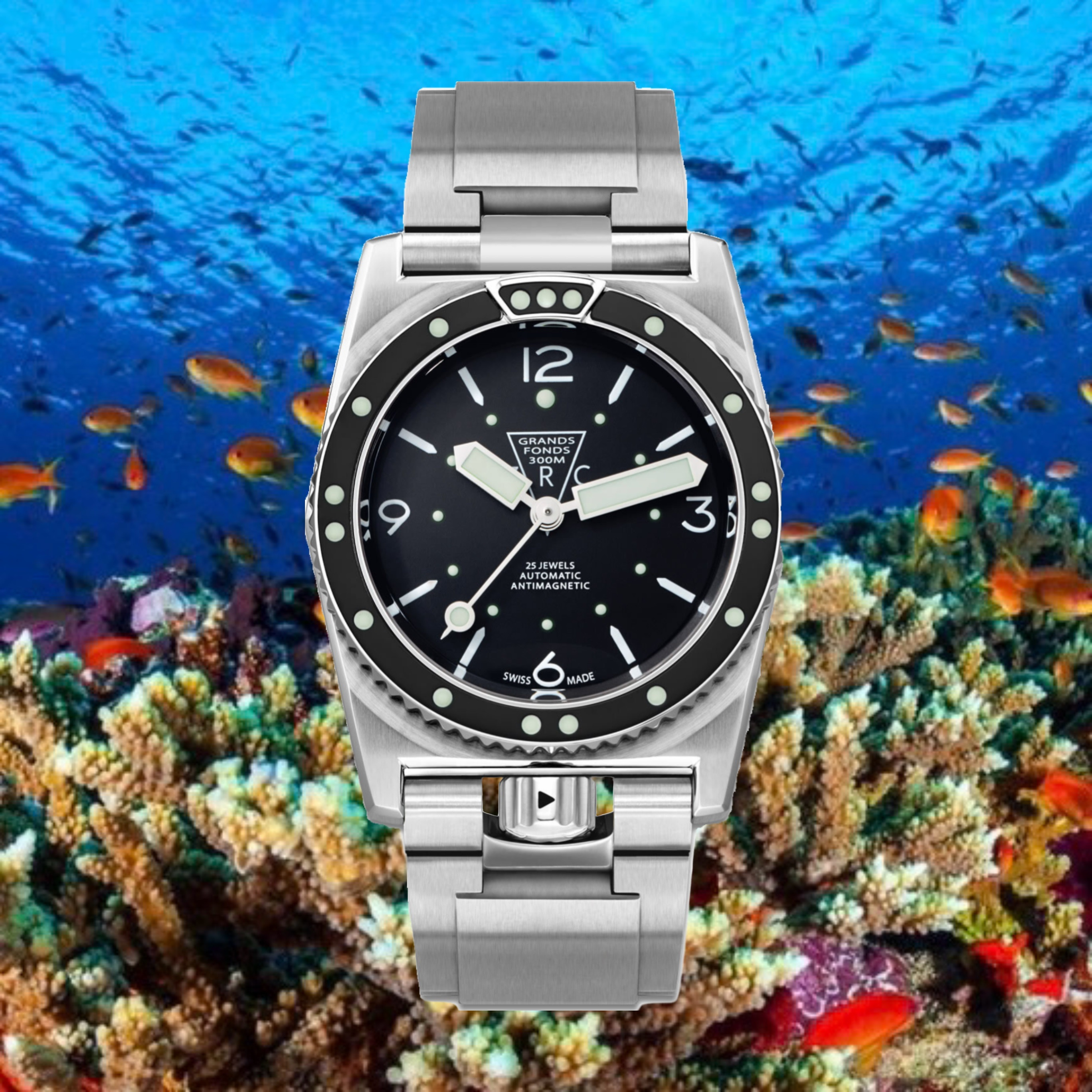 Die Grands Fonds 300 ist mit einem automatisch verstellbaren Metallband ausgestattet, mit dem sie problemlos über einem Tauchanzug getragen werden kann. Dieses einzigartige eingebettete Federsystem passt sich automatisch dem Durchmesser des Handgelenks des Trägers an und bietet unvergleichlichen Komfort. Es sind keine zusätzlichen Einstellungen erforderlich, da sich zwei Glieder auf beiden Seiten des Gehäuses automatisch verlängern, um sich dem neuen Durchmesser anzupassen. Das ECS ™ ist eine technische Lösung für ein Problem, mit dem sich die Minentaucher der Marine Nationale während ihrer vielen Tauchgänge befassen: Salz kristallisiert in den Zwischenräumen zwischen der Lünette und dem Gehäuse und behindert so dessen Rotation. Für die Neuauflage des Grands Fonds 300 im Jahr 2015 hat ZRC eine funktionale Lösung entwickelt und patentiert – das ECS™. Es ist dies ein einzigartiges System zur Reinigung des Inneren der Frontblende durch zirkulierendes frisches Wasser, welches das Meersalz verdünnt und gleichzeitig abführt. Dank dieses exklusiven Bandsystems mit einziehbaren Ösen ist 100%-ige Sicherheit garantiert. Dadurch wird es verunmöglicht, die Uhr im Wasser zu tragen, ohne dass die Krone wieder in ihre ursprüngliche Position verschraubt ist. Dies wird dadurch ermöglicht, dass sofern die Krone nicht sicher verschraubt sein sollte, das Band nicht richtig positioniert werden kann und ein Tragen der Uhr verhindert wird. Diese effektive Methode garantiert nicht, dass die Uhr in unverschraubtem Zustand nicht getragen werden kann, sondern zugleich auch, dass sich die Krone in getragenem Zustand nicht lösen kann.