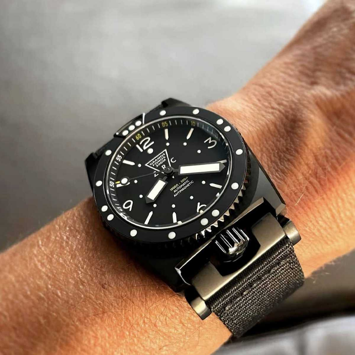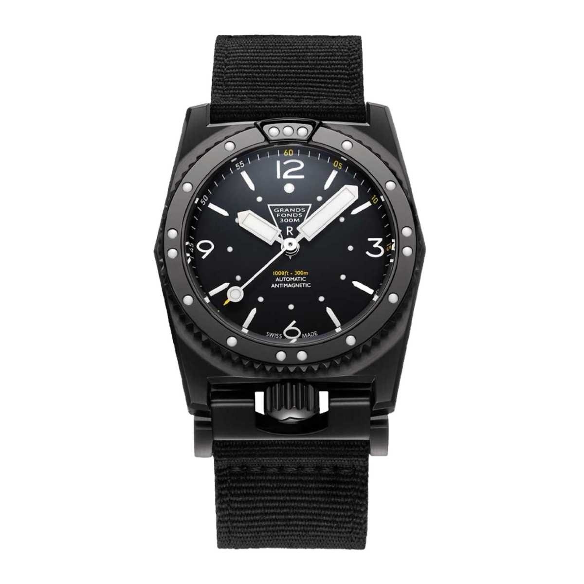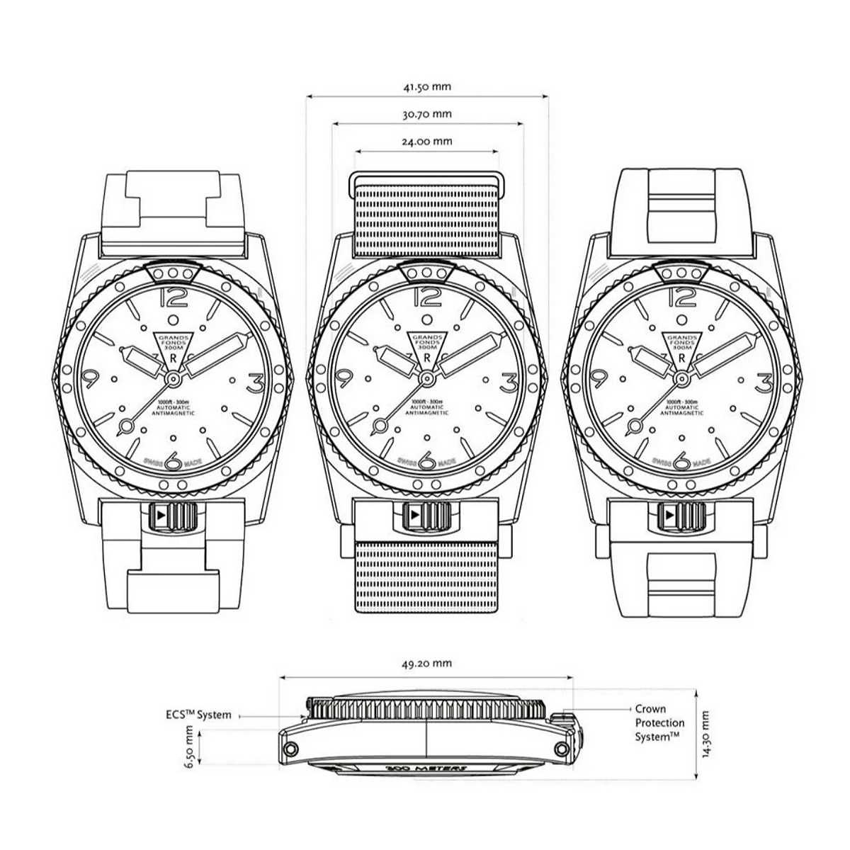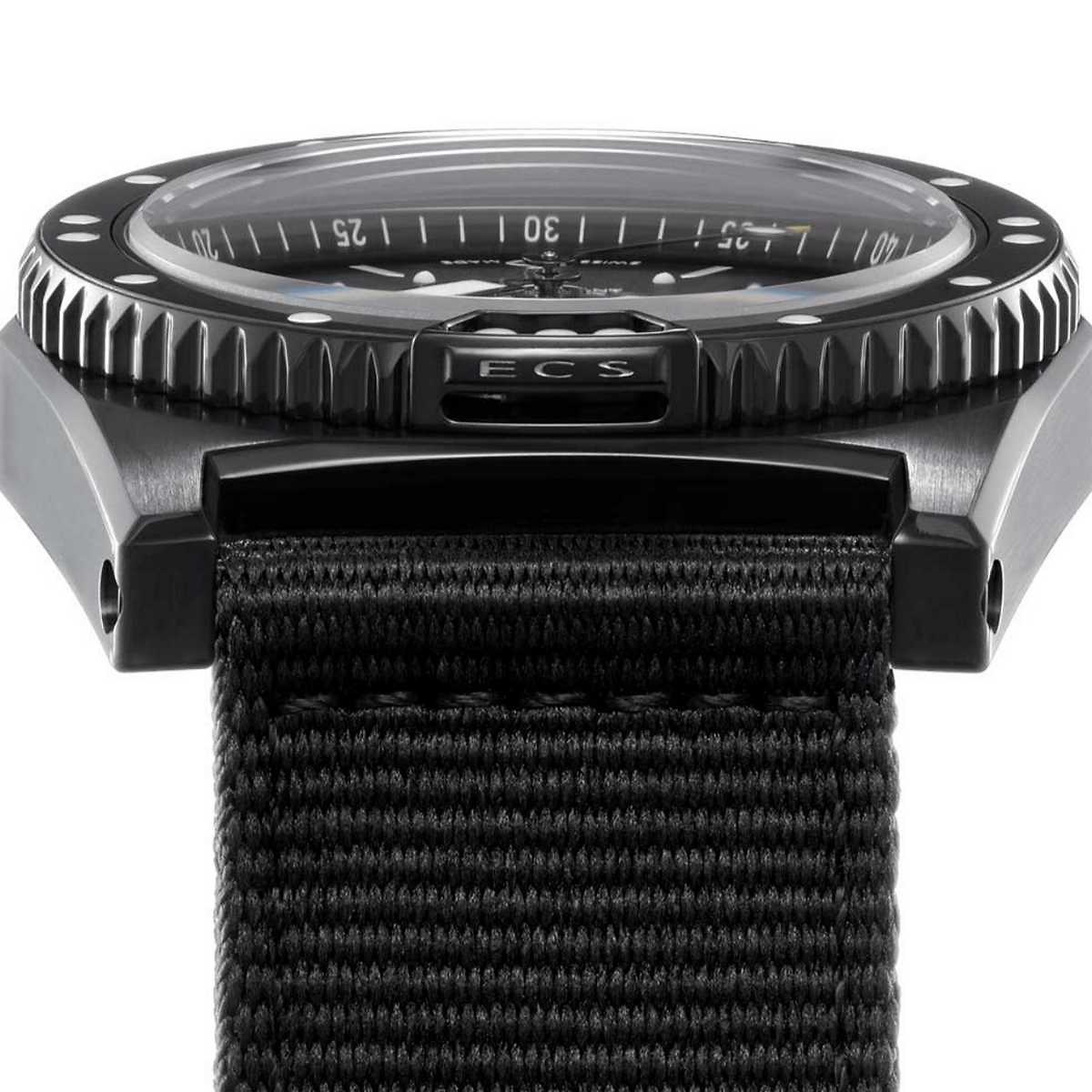 Die neue Grands Fonds 300 Black Phantom ist nicht nur DLC-beschichtet, sondern auch mit einem exklusiven 2-teiligen NATO-Band ausgestattet, mit dem es über einem Tauchanzug getragen werden kann. Diese einzigartige eingebettete NATO-Konfiguration passt sich automatisch dem Durchmesser des Handgelenks des Trägers an, um unvergleichlichen Komfort zu bieten. Das ECS ™ ist eine technische Lösung für ein Problem, mit dem sich die Minentaucher der Marine Nationale während ihrer vielen Tauchgänge befassen: Salz kristallisiert in den Zwischenräumen zwischen der Lünette und dem Gehäuse und behindert so dessen Rotation. Für die Neuauflage des Grands Fonds 300 im Jahr 2015 hat ZRC eine funktionale Lösung entwickelt und patentiert – das ECS™. Es ist dies ein einzigartiges System zur Reinigung des Inneren der Frontblende durch zirkulierendes frisches Wasser, welches das Meersalz verdünnt und gleichzeitig abführt. Dank dieses exklusiven Bandsystems mit einziehbaren Ösen ist 100%-ige Sicherheit garantiert. Dadurch wird es verunmöglicht, die Uhr im Wasser zu tragen, ohne dass die Krone wieder in ihre ursprüngliche Position verschraubt ist. Dies wird dadurch ermöglicht, dass sofern die Krone nicht sicher verschraubt sein sollte, das Band nicht richtig positioniert werden kann und ein Tragen der Uhr verhindert wird. Diese effektive Methode garantiert nicht, dass die Uhr in unverschraubtem Zustand nicht getragen werden kann, sondern zugleich auch, dass sich die Krone in getragenem Zustand nicht lösen kann.
