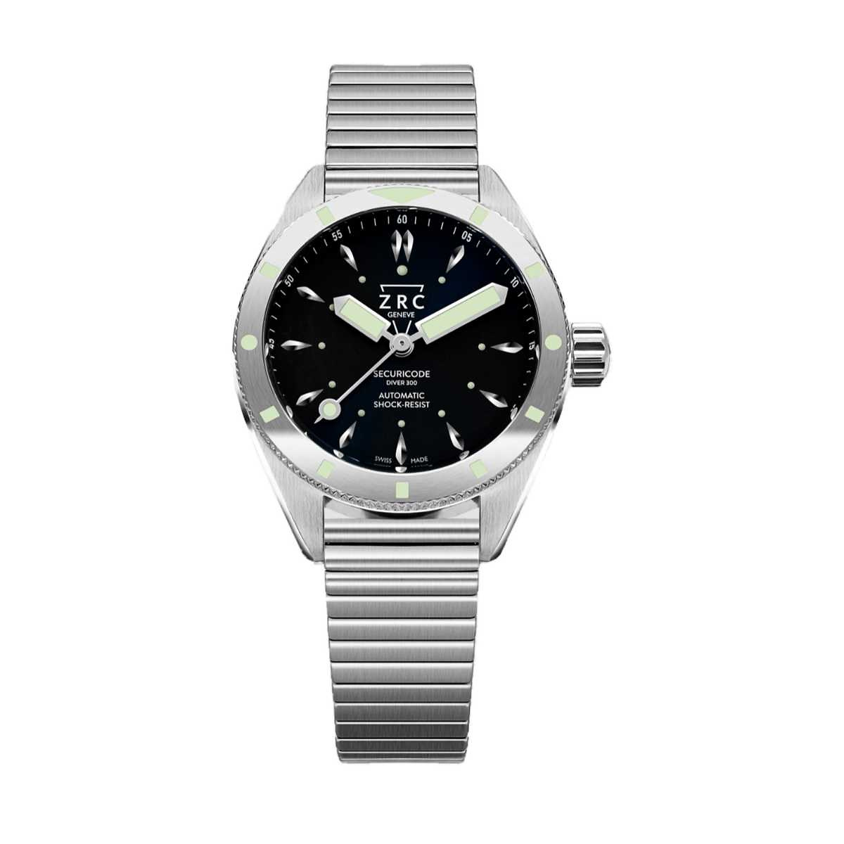 Anlässlich seines 120-jährigen Bestehens stellt ZRC® eine neue Kollektion mit dem vielsagenden Namen SECURICODE vor. Drei Modelle mit Vintage-Akzenten in verschiedenen Materialien eröffnen dieses spannende Kapitel in der Geschichte der Marke. Die neue SECURICODE ist dem Modell S1 von 1958 treu geblieben und überzeugt durch ihre hochwertige Verarbeitung. Guillochiertes Zifferblatt, super leuchtende Magnumzeiger und Vintage-Dehnungsband. Mit ihrem schwarzen Zifferblatt, dem satinierten Stahlgehäuse und dem Dehnmetallband bleibt diese Version der ersten ZRC® von 1958 sehr treu. Das doppelt guillochierte Messingzifferblatt ist mit einer Lünette versehen, deren Einsatz aus demselben Material gefräst ist. Das Gehäuse hat eine runde, gebürstete Oberfläche wie bei den Originalmodellen. Diese zeitgemässe Neuinterpretation hat einen ausgeprägten Retro-Chic. Die Zeiger werden von einem leistungsstarken Automatikkaliber SW200-1 in seiner ausgefeilten Version angetrieben.